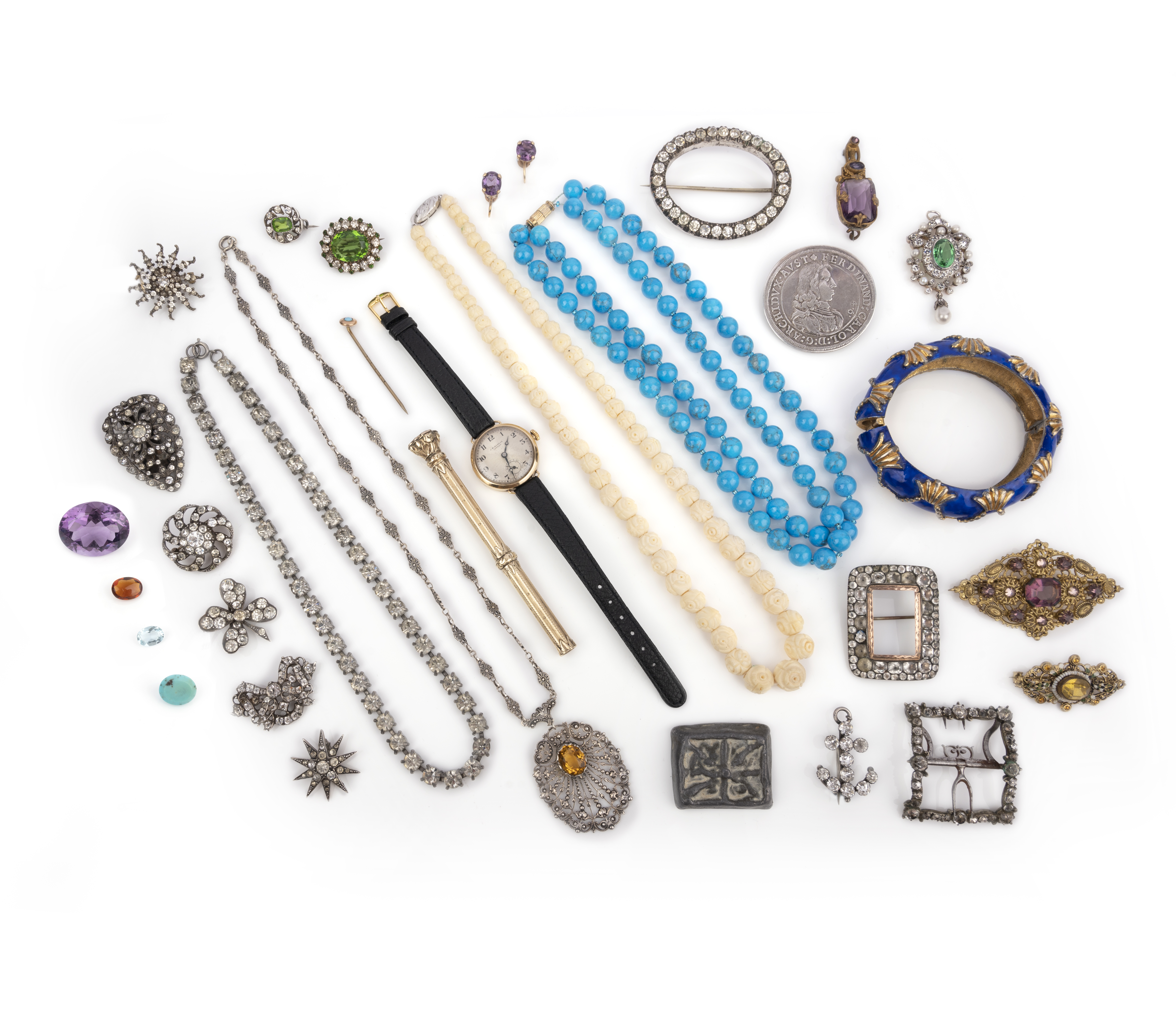 A collection of jewels, comprising: a manual winding gold wristwatch by JW Benson, the reverse with the monogram for George VI, dated 1937; fifteen paste brooches, largest 6.2cm; a dyed blue stone bead necklace; a carved bone necklace; a colourless paste necklace; a foliate silver pendant necklace set with an oval citrine; an enamel bangle; a pair of amethyst earrings; a turquoise stick pin; a paste and simulant pearl pendant; a gold propelling pencil, the end set with bloodstone; a brooch made from a large Thaler coin dated 1648; a lead ingot; a paste buckle; a turquoise cabochon, an oval amethyst and an oval blue paste