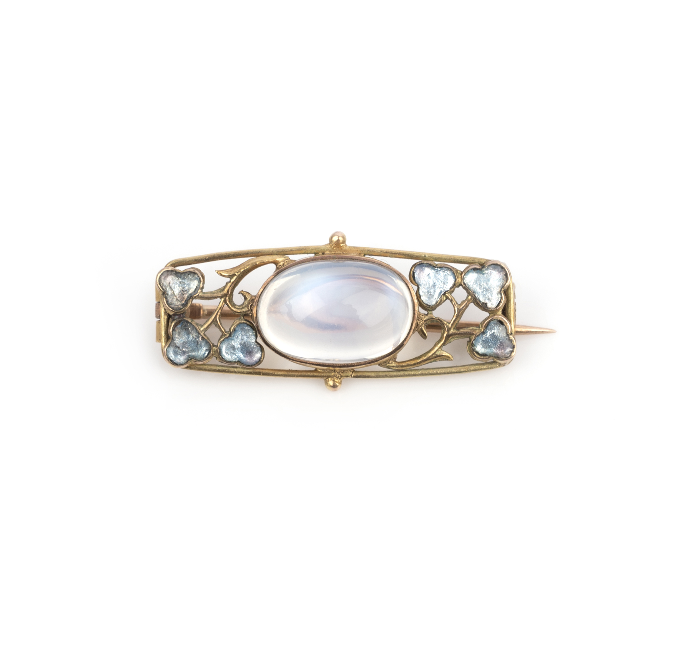 An Arts and Crafts moonstone and enamel brooch, early 20th century, set with a cabochon moonstone,