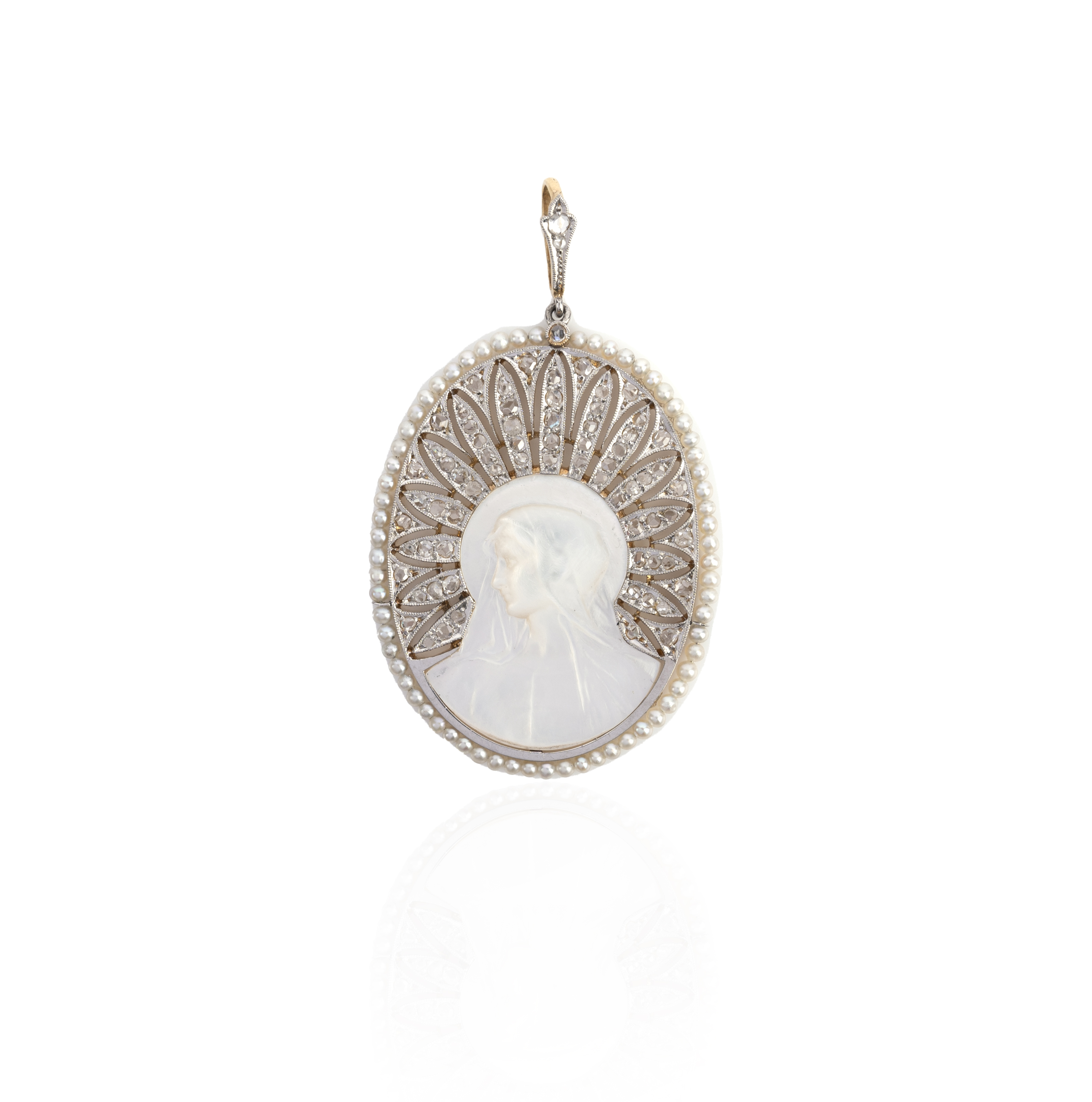 A Belle Epoque mother of pearl, seed pearl and diamond pendant, circa 1900, set with a section of mother of pearl finely carved in shallow relief with a depiction of the Madonna, within an openwork halo set with rose-cut diamonds, to an outer oval frame bordered with seed pearls, suspended from a rose-cut diamond bail, length 5.5cm including bail, pearls untested