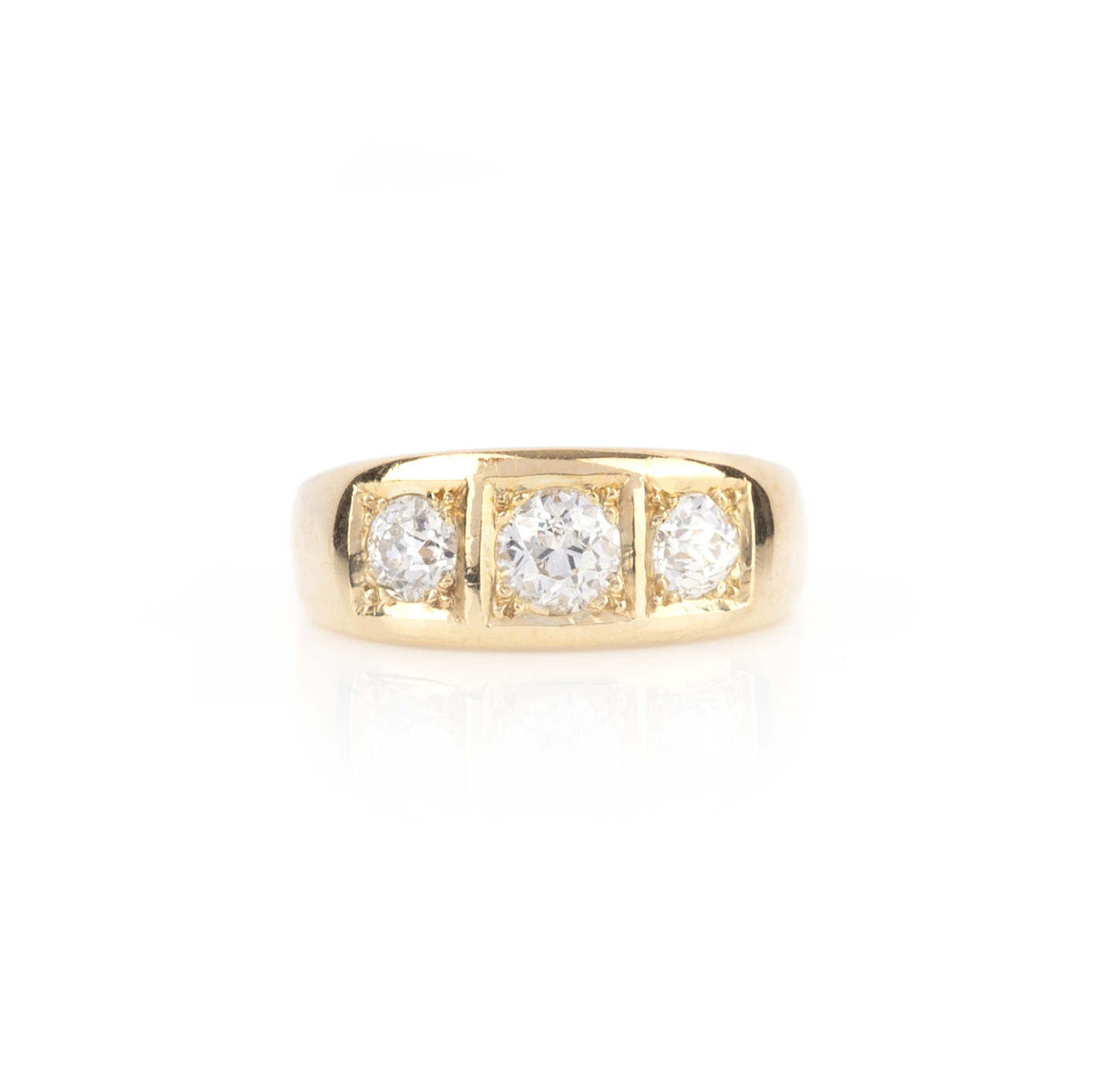 A late 19th century diamond three stone ring, set with graduated old cushion-shaped diamonds in yellow gold, size O