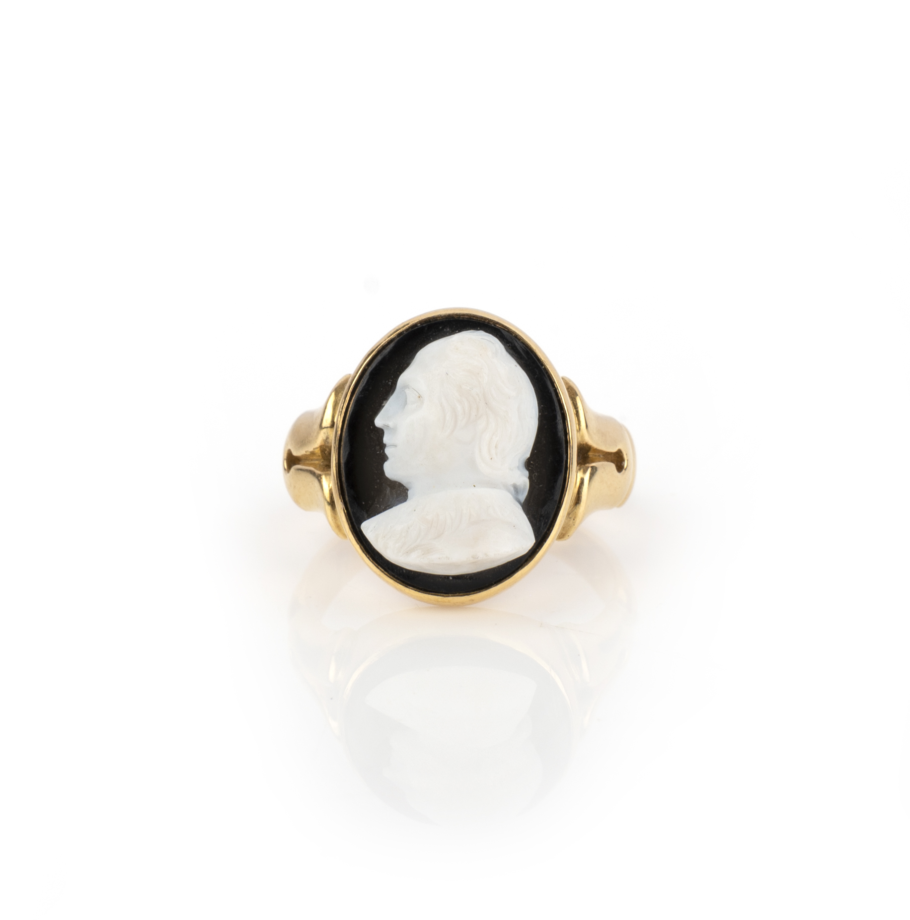 An onyx cameo ring, circa 1881, set with an oval onyx cameo depicting the philosopher John Locke