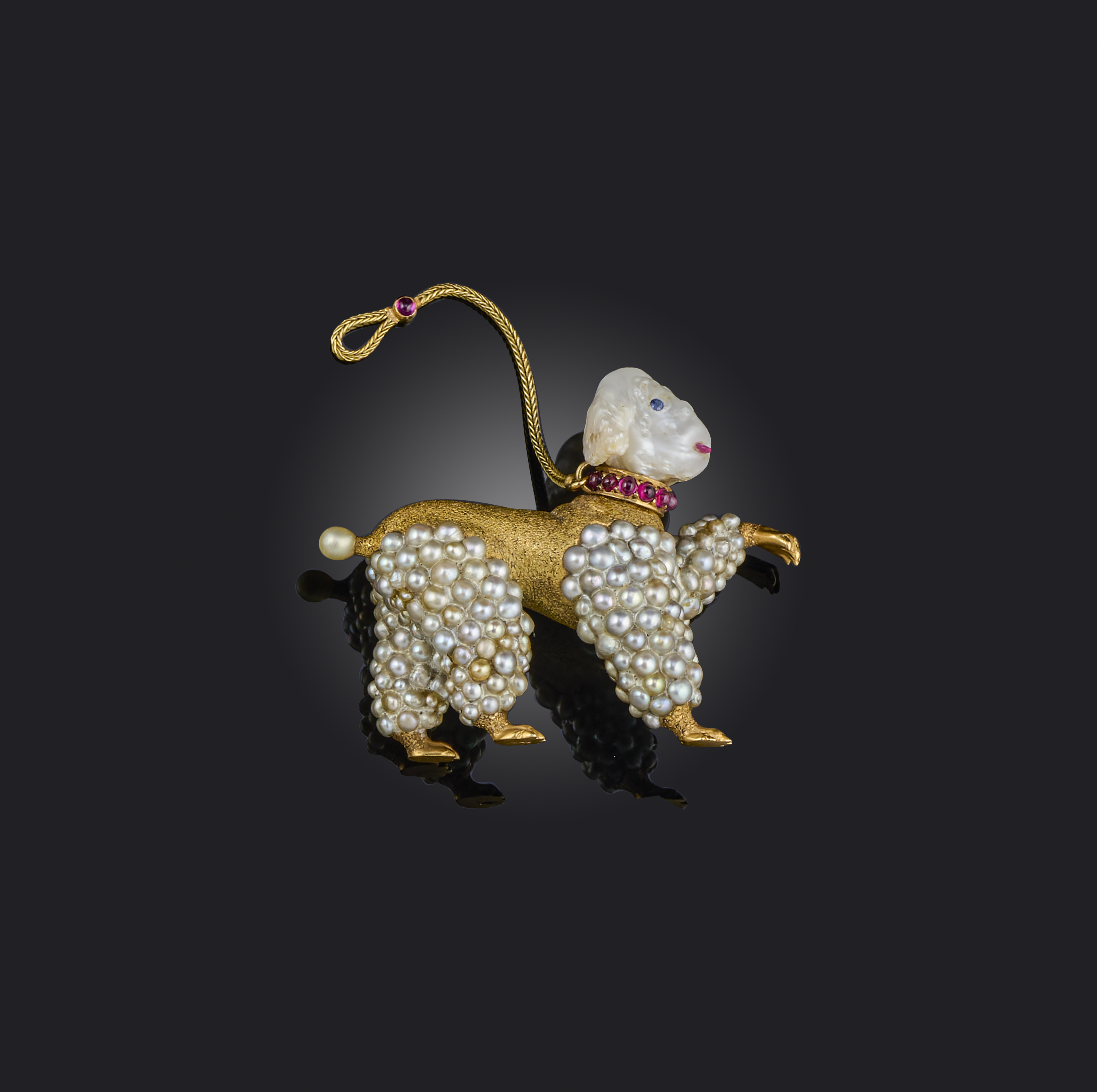 A late 19th century gold poodle brooch, the stylised dog with a pearl forming its face, with sapphire eyes and a ruby tongue, the gold body with seed pearl legs, French control marks and indistinct maker's lozenge, length 4.5cm, 55g