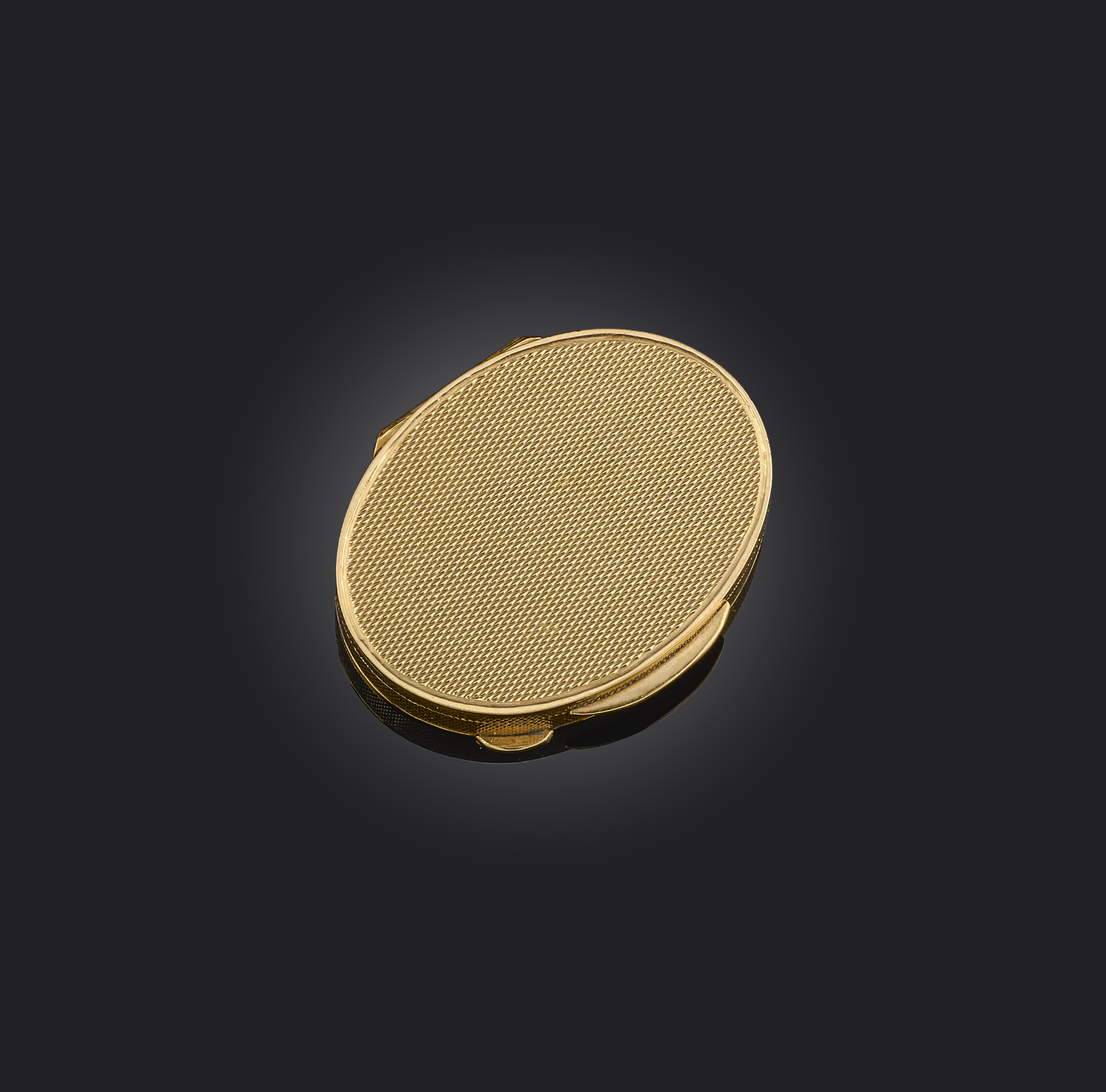 An oval gold pill box, with engine turned decoration, hinged opening, signed Cartier London and