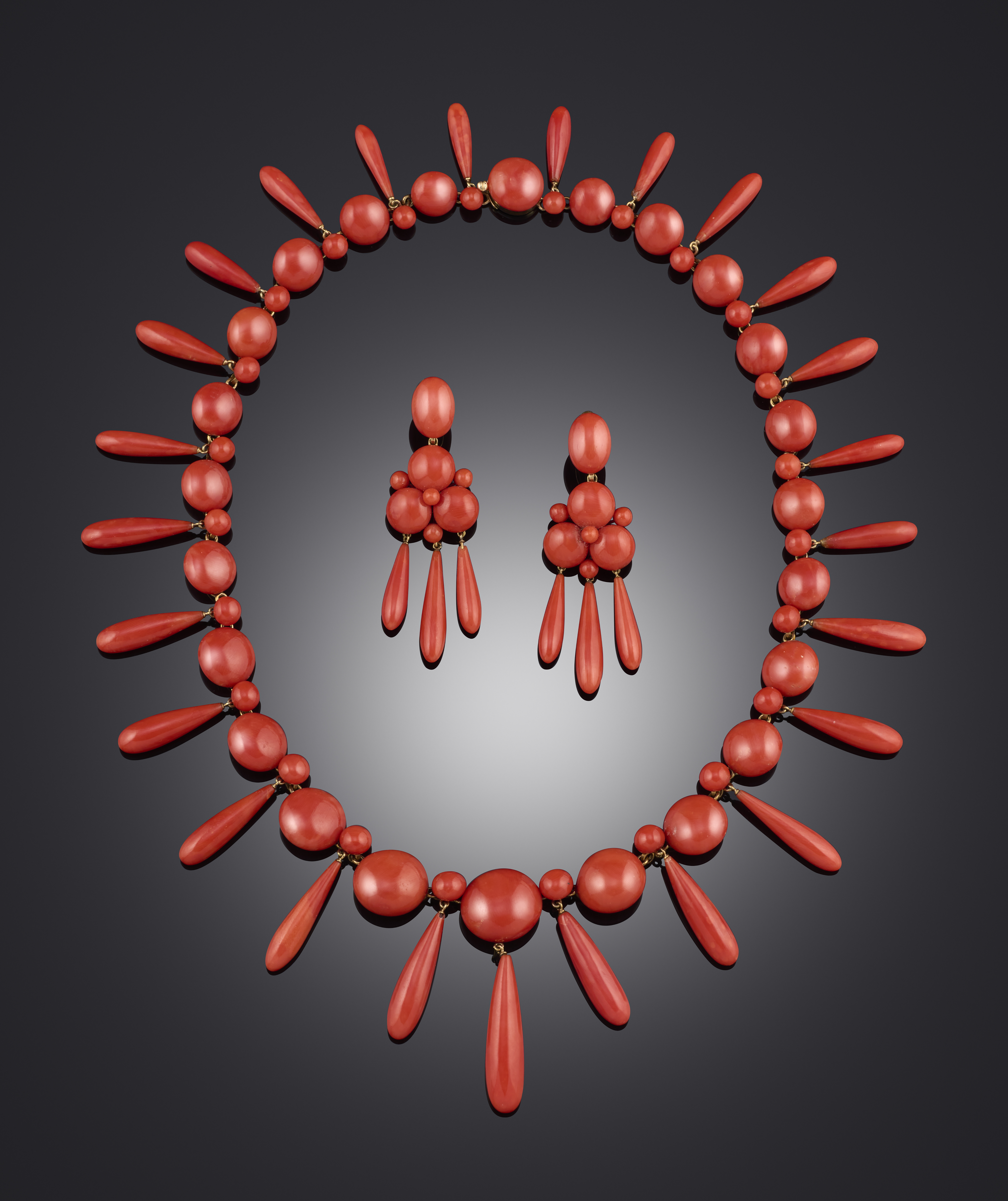 λ A fine coral demi-parure, mid 19th century, comprising: a necklace, composed of graduated bouton-shaped coral cabochons suspending a fringe of coral drops, mounted in gold length 44.5cm, French import assay mark for 9ct gold; and a pair of earrings of similar design, length 6.4cm each, screw fittings, fitted case