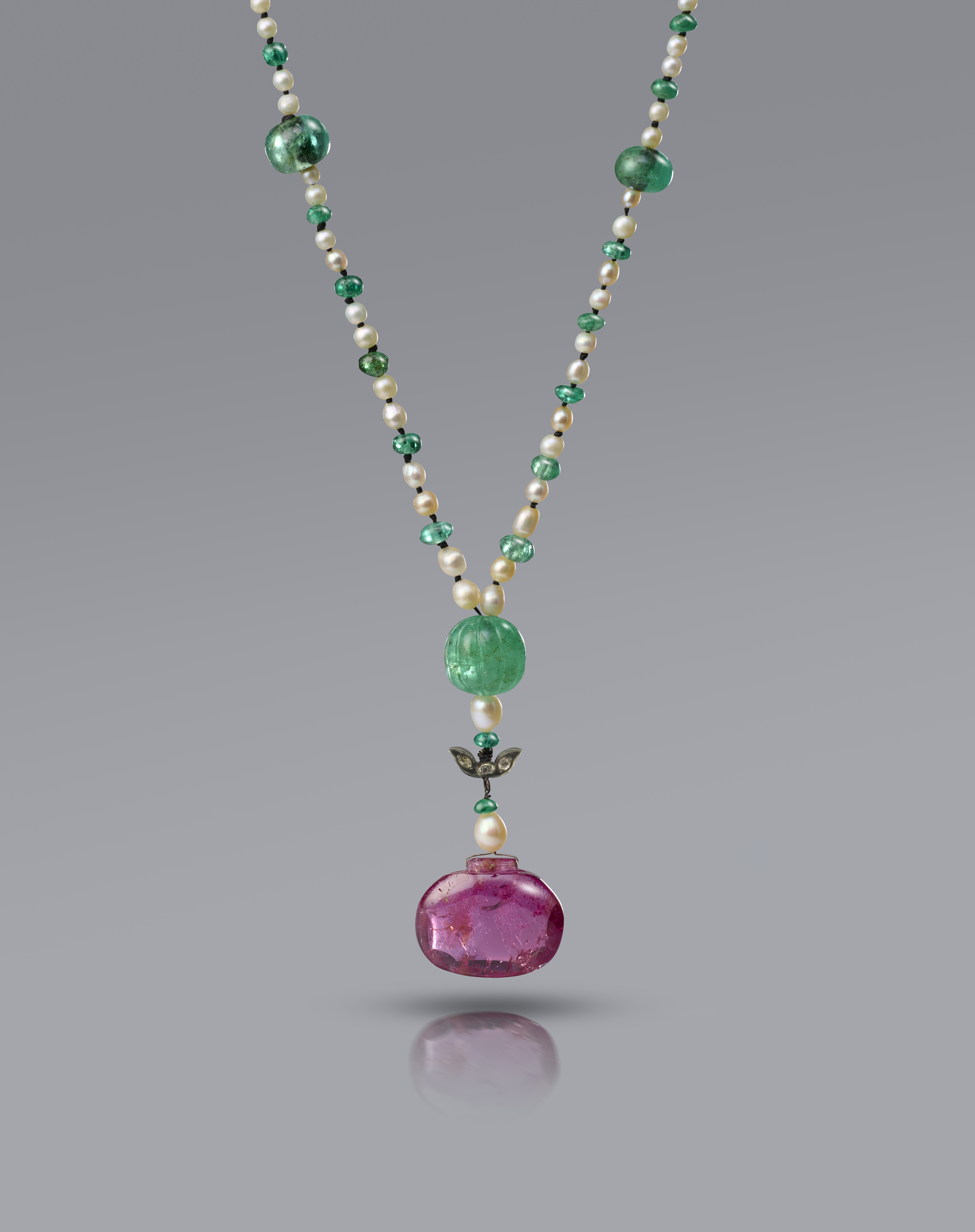 A spinel, pearl and emerald necklace, composed of a necklace threaded with pearls measuring