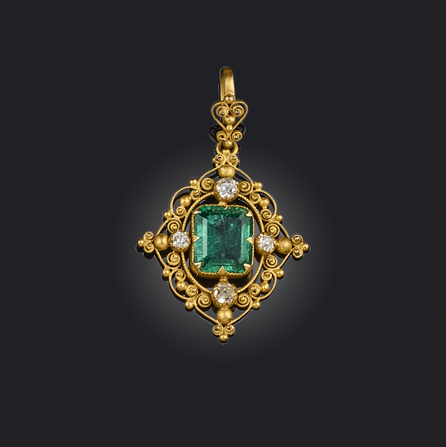 A Regency emerald and diamond pendant, set with an emerald-cut emerald weighing approximately 1.90cts, within quatrefoil surround set with diamonds and cannetille surround, plaque for 18ct, length 3.8cm