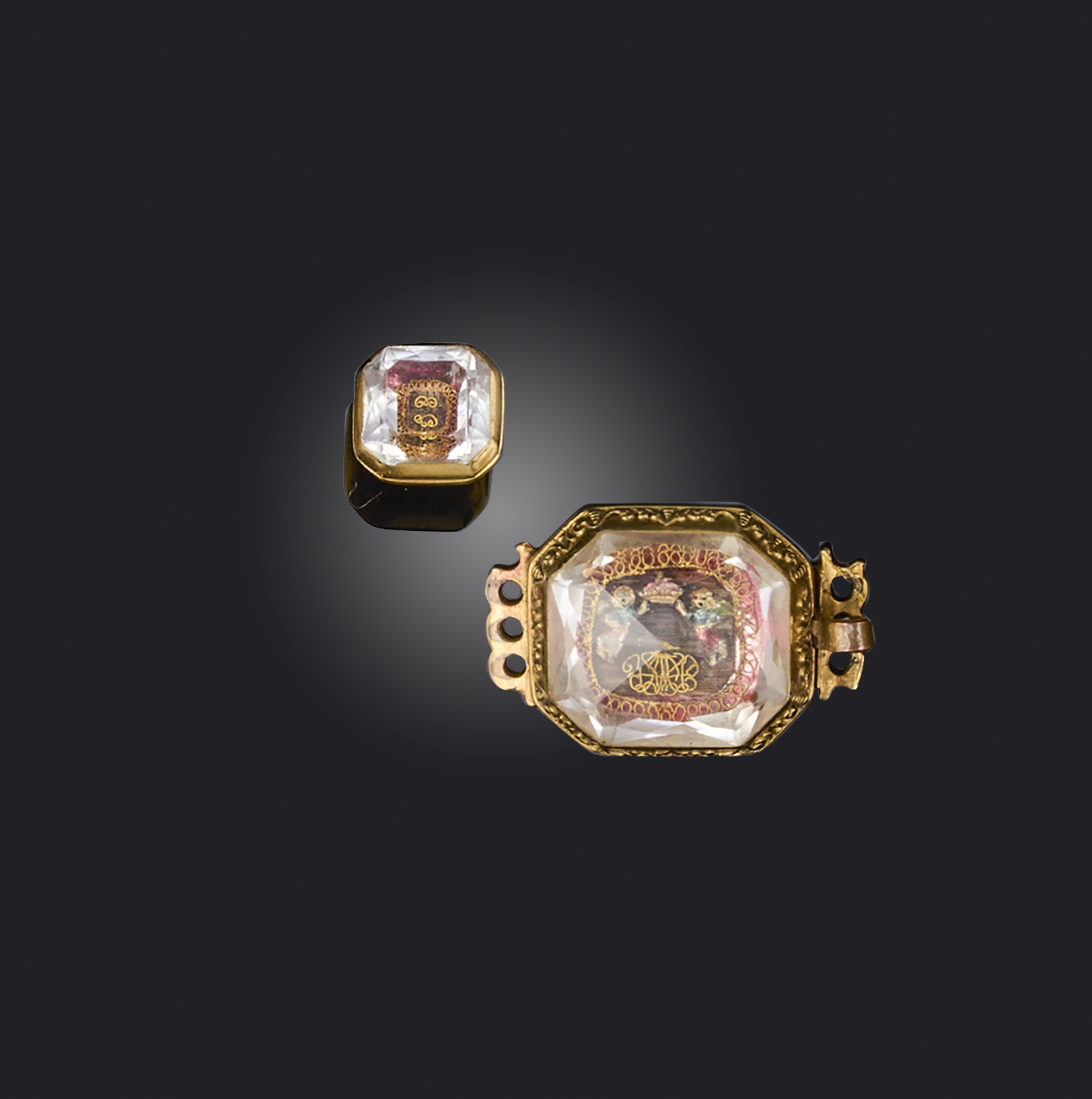 A Stuart crystal slide / clasp, depicting two putti holding a heart over initials, under faceted crystal in yellow gold, width 2.2cm, with a similar Stuart crystal button in yellow gold, 9mm, case