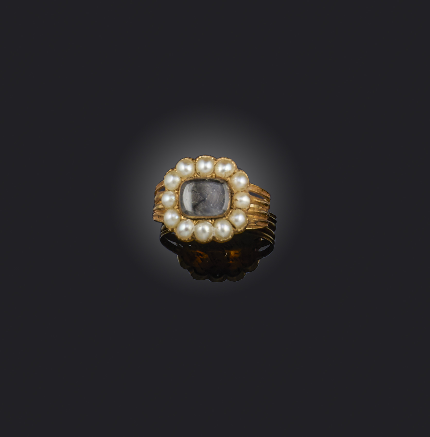 An early 19th century seed pearl mourning ring, centring on a glazed locket compartment within a surround of seed pearls in 18ct gold, inscribed to reverse for Catherine Waring, died 15th Jan, obscured Birmingham hallmarks for 18ct, size L