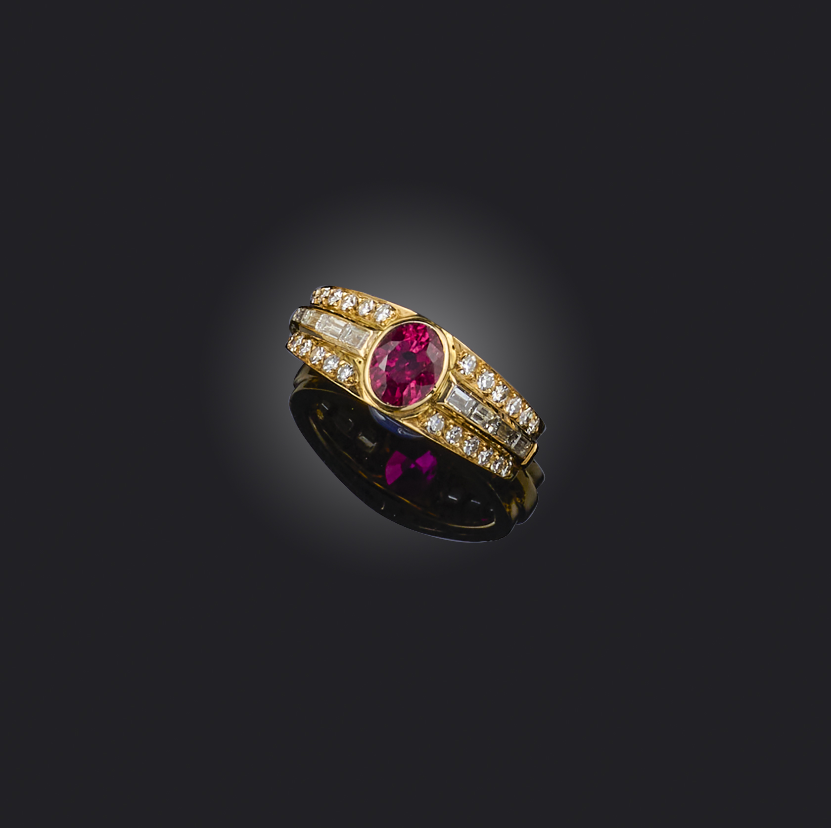 A ruby and diamond ring, set with an oval ruby within diamond-set shoulders in yellow gold, size M