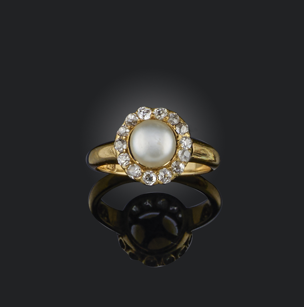 A pearl and diamond ring, late 19th century, centring on a bouton pearl measuring approximately 6.4