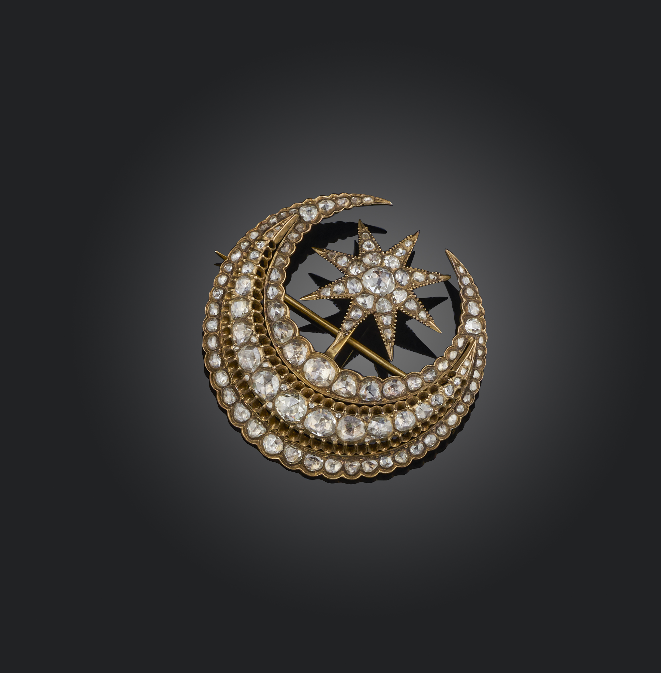 A diamond brooch, designed as the Islamic symbol of the crescent moon and star, set with rose-cut