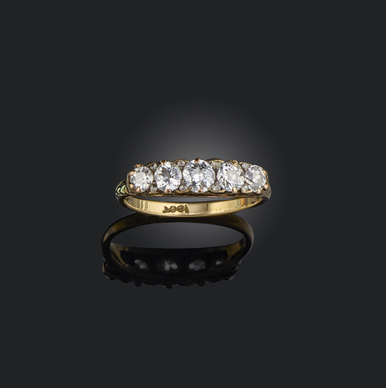 A diamond five stone ring, set with graduated old cushion-shaped diamonds in carved and pierced