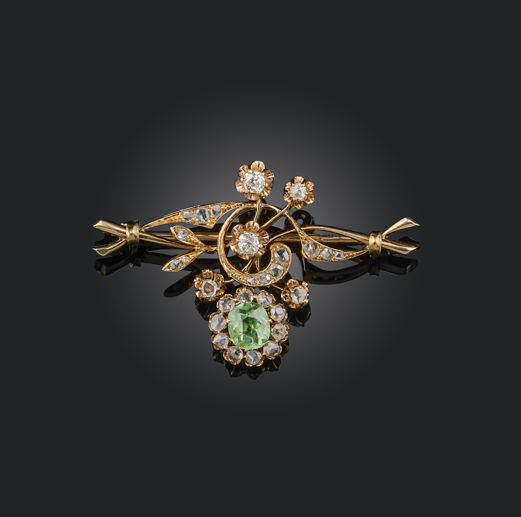 A demantoid garnet and diamond brooch, late 19th century, of floral design, set with a cushion-shape