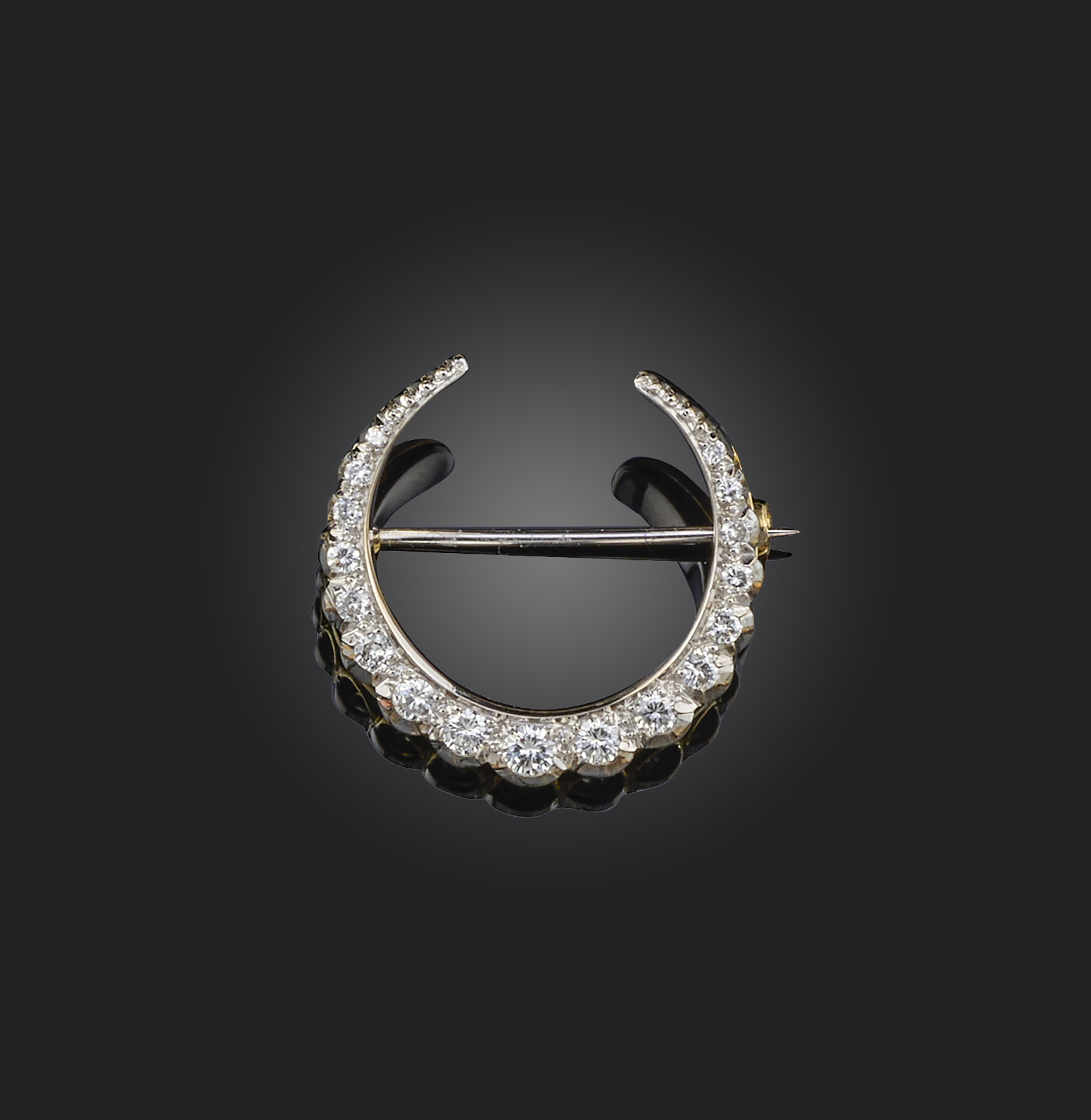 A diamond brooch, designed as a crescent moon, set with a line of graduated brilliant-cut diamonds,