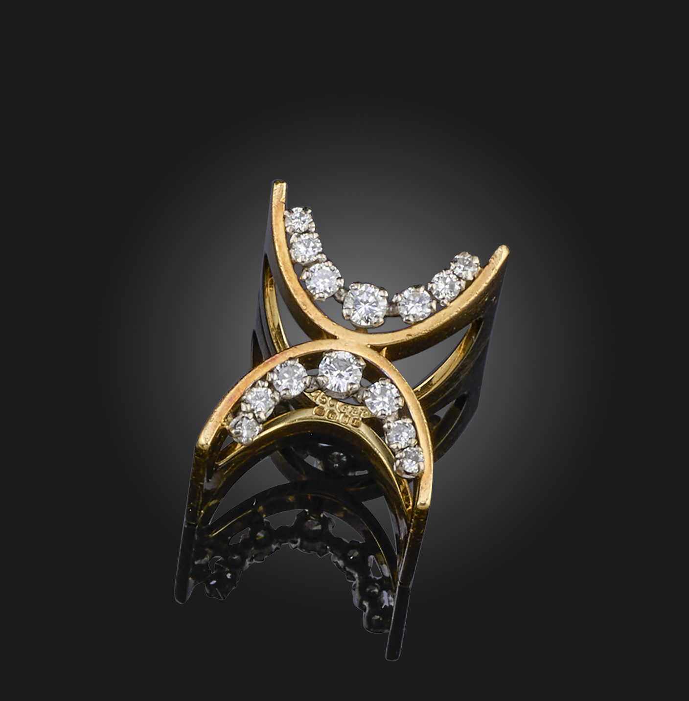 Φ Gilian Packard, a diamond ring of sculptural design, the connecting arcs each set with graduated round brilliant-cut diamonds in 18ct yellow gold, maker's mark GEP and London hallmarks for 1972, approximate ring size J