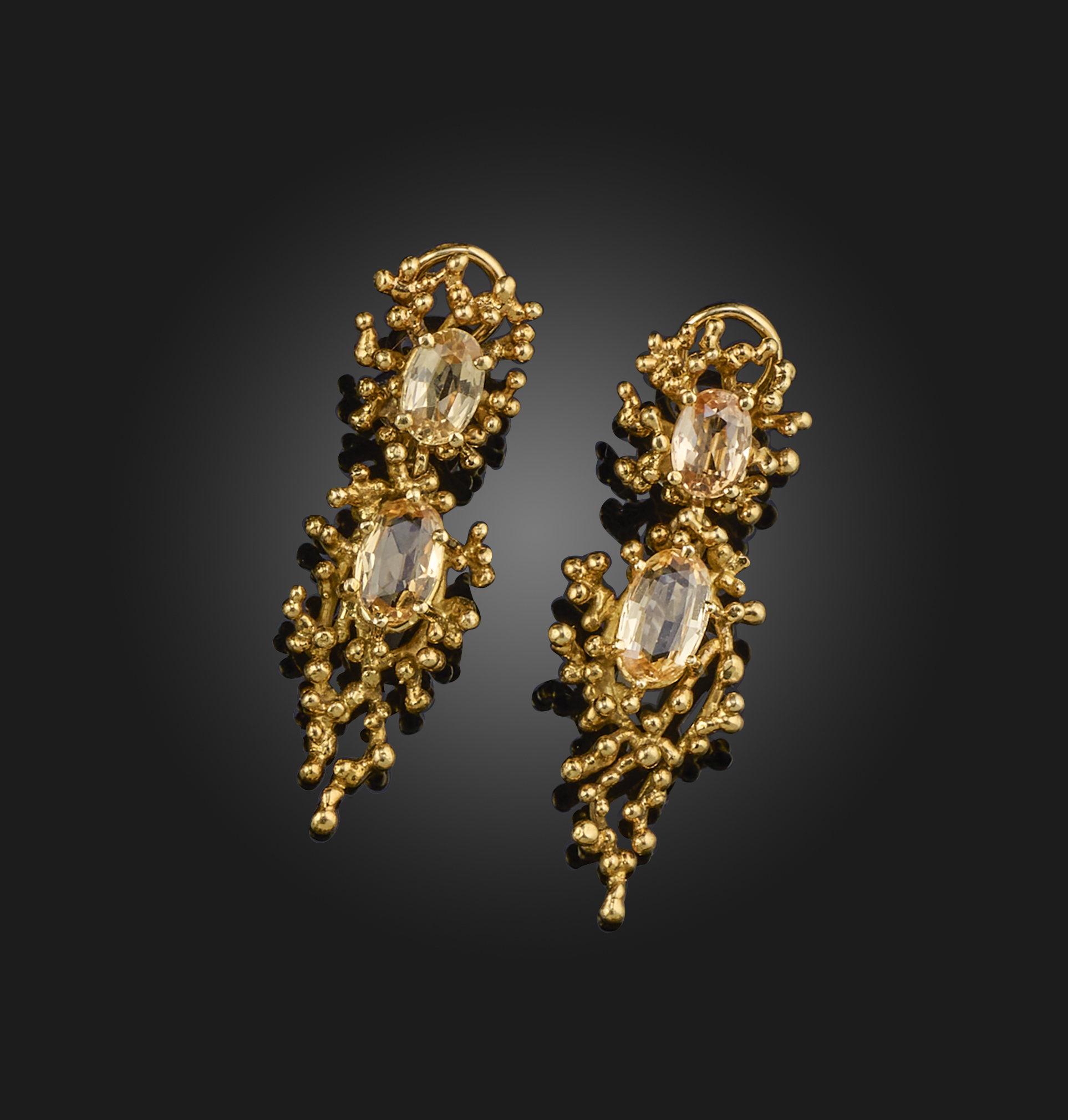 A pair of topaz and gold drop earrings, of stylised design set with graduated oval-shaped topaz within pellet-work abstract border in 18ct yellow gold, London import marks for 1977, clip fittings, length 4.5cm