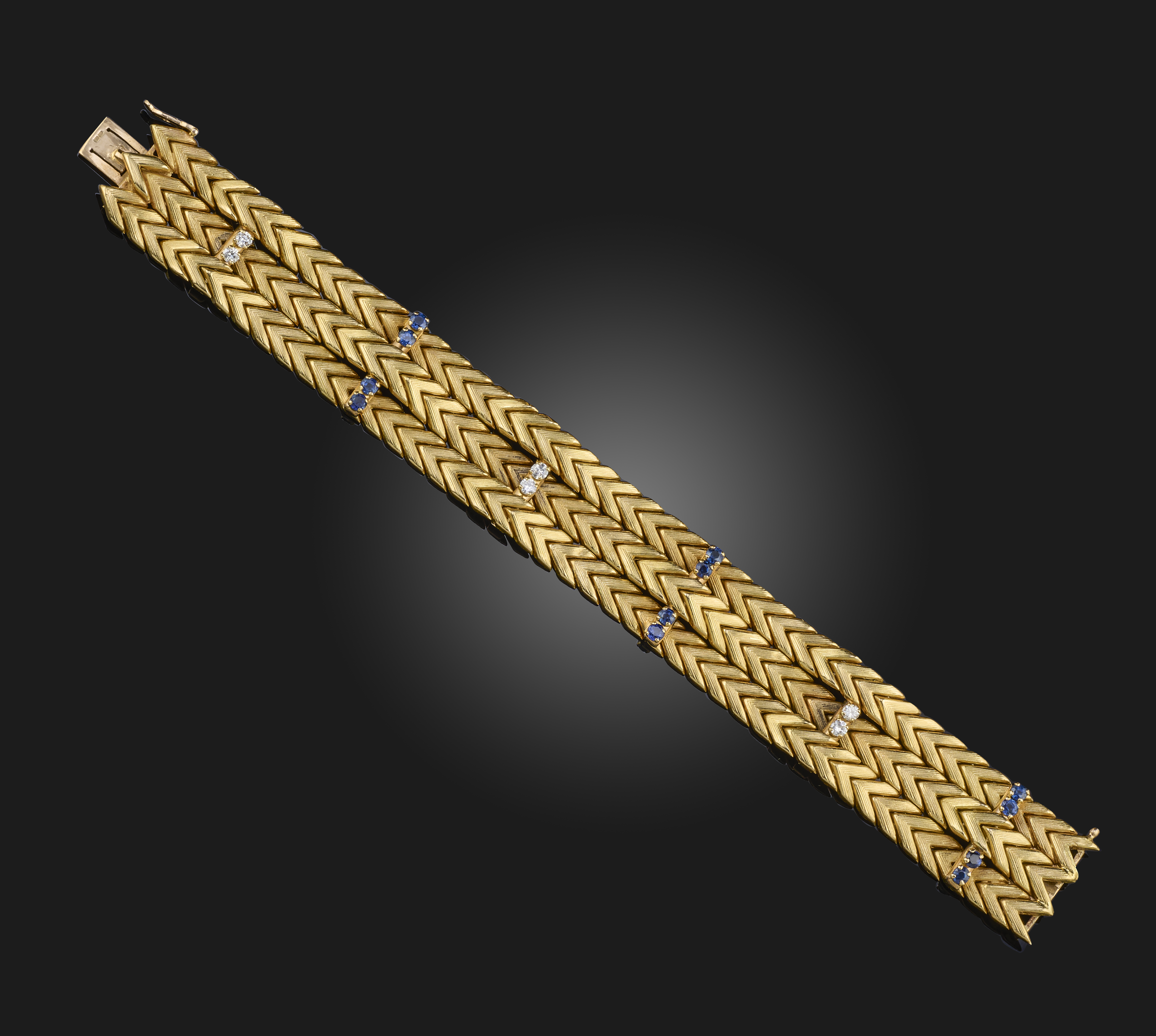 Kutchinsky, a gold, sapphire and diamond bracelet, London, circa 1966, designed as three articulated rows of gold chevron linking, woven through bar links set with circular-cut sapphires and brilliant-cut diamonds, length 18.5cm, signed Kutchinsky, British hallmarks for 18ct gold, date letter l for 1966, maker's mark Kld