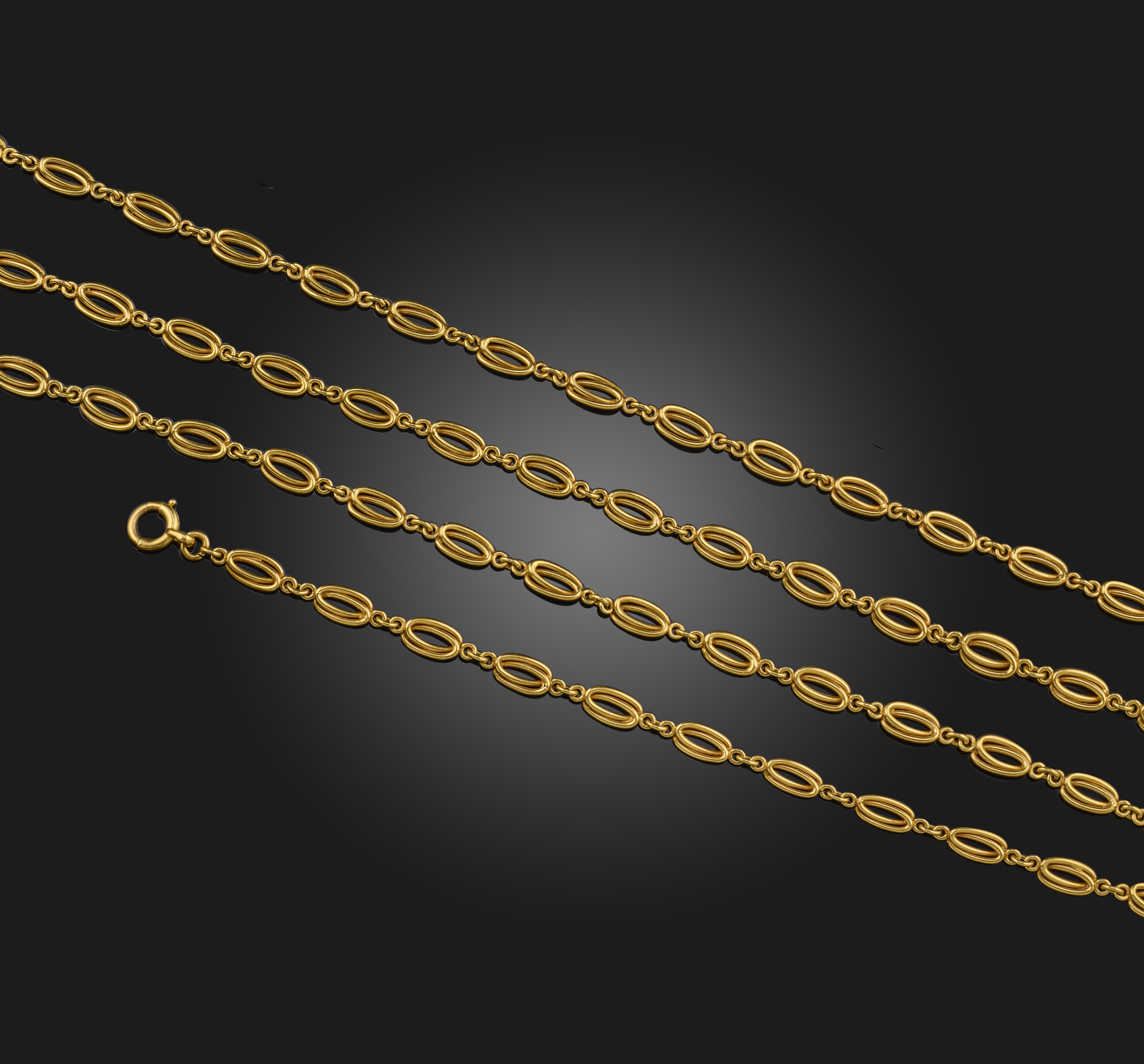 A gold longchain, France, late 19th century, composed of interlocking oval links in gold wire,