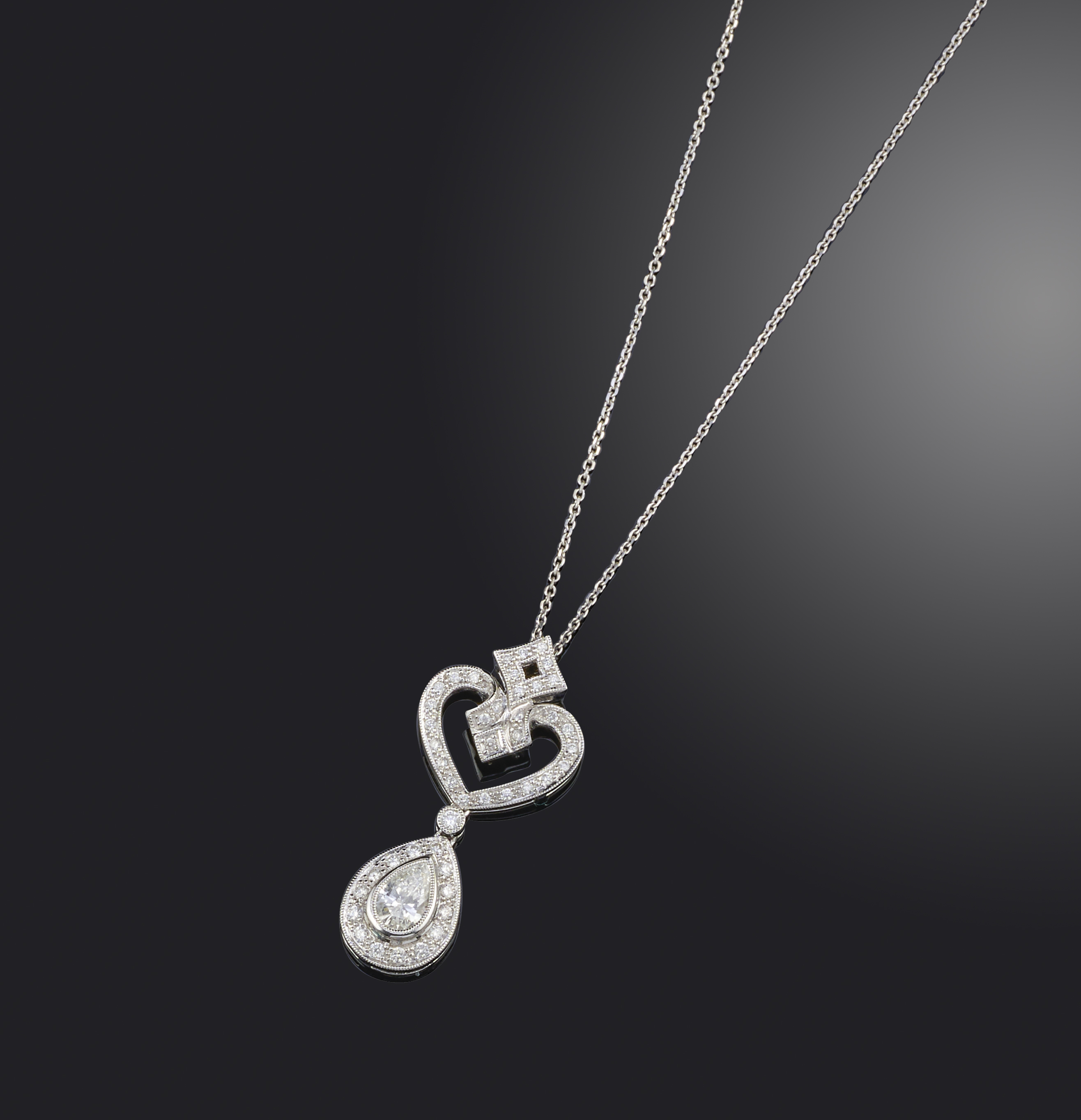 A diamond pendant necklace, designed as a stylised heart motif suspending a drop pendant, set with brilliant-cut diamonds and a pear-shaped diamond weighing approximately 0.60 carats, mounted in white gold, pendant length 3.6cm, chain length 50cm