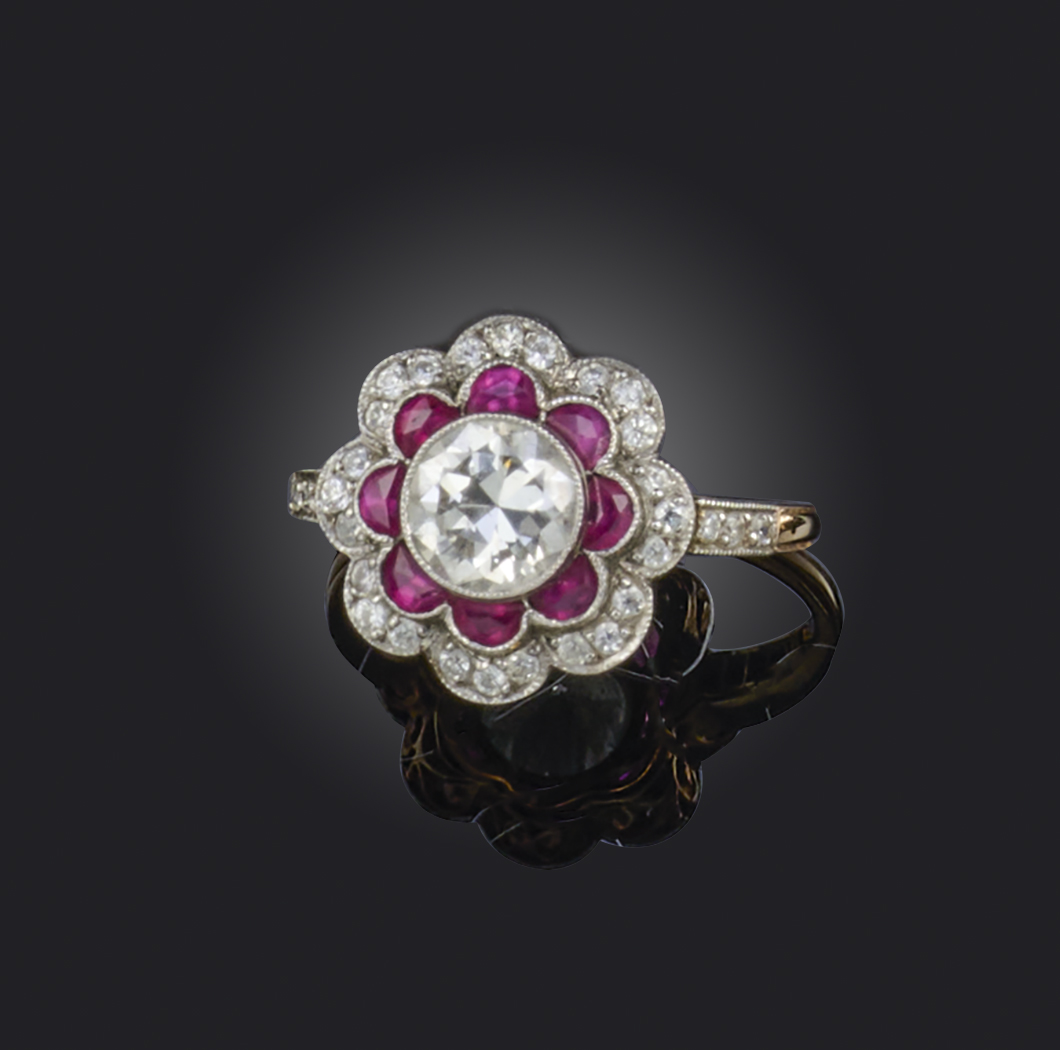 A diamond and ruby ring, early 20th century, of cluster design, set with a circular-cut diamond weighing approximately 1.10 carats, within a floral border of demi-lune rubies and circular-cut diamonds, mounted in gold and platinum, size O