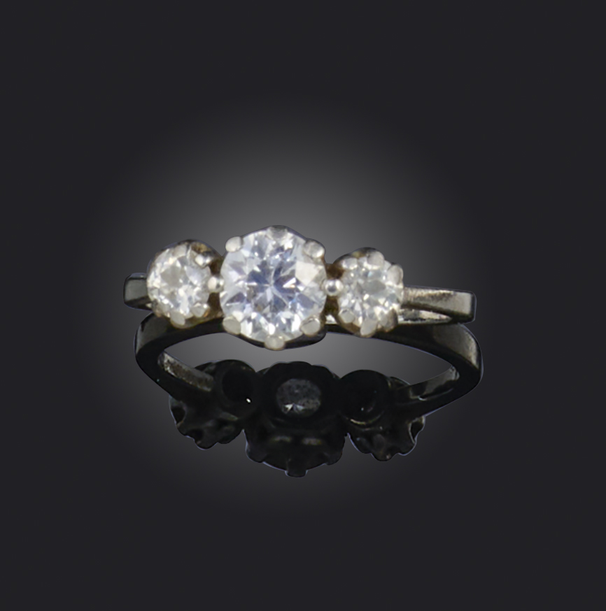 A diamond three stone ring, set with three graduated circular-cut diamonds weighing approximately