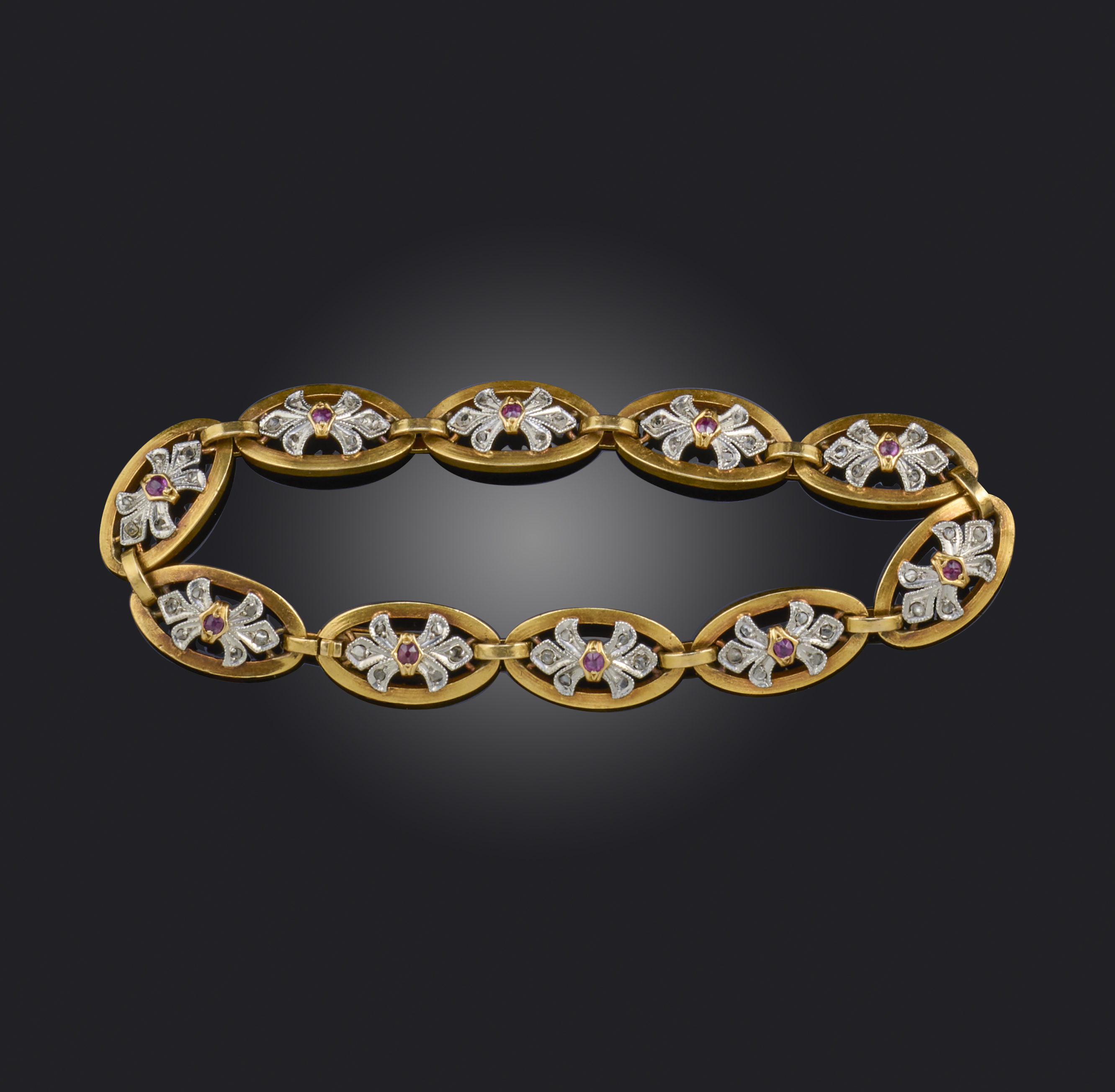 A ruby and diamond bracelet, early 20th century, composed of navette-shaped links centring on foliate motifs set with rose-cut diamonds and circular-cut rubies, mounted in gold and platinum, length 17cm, French assay marks for 18ct gold and platinum