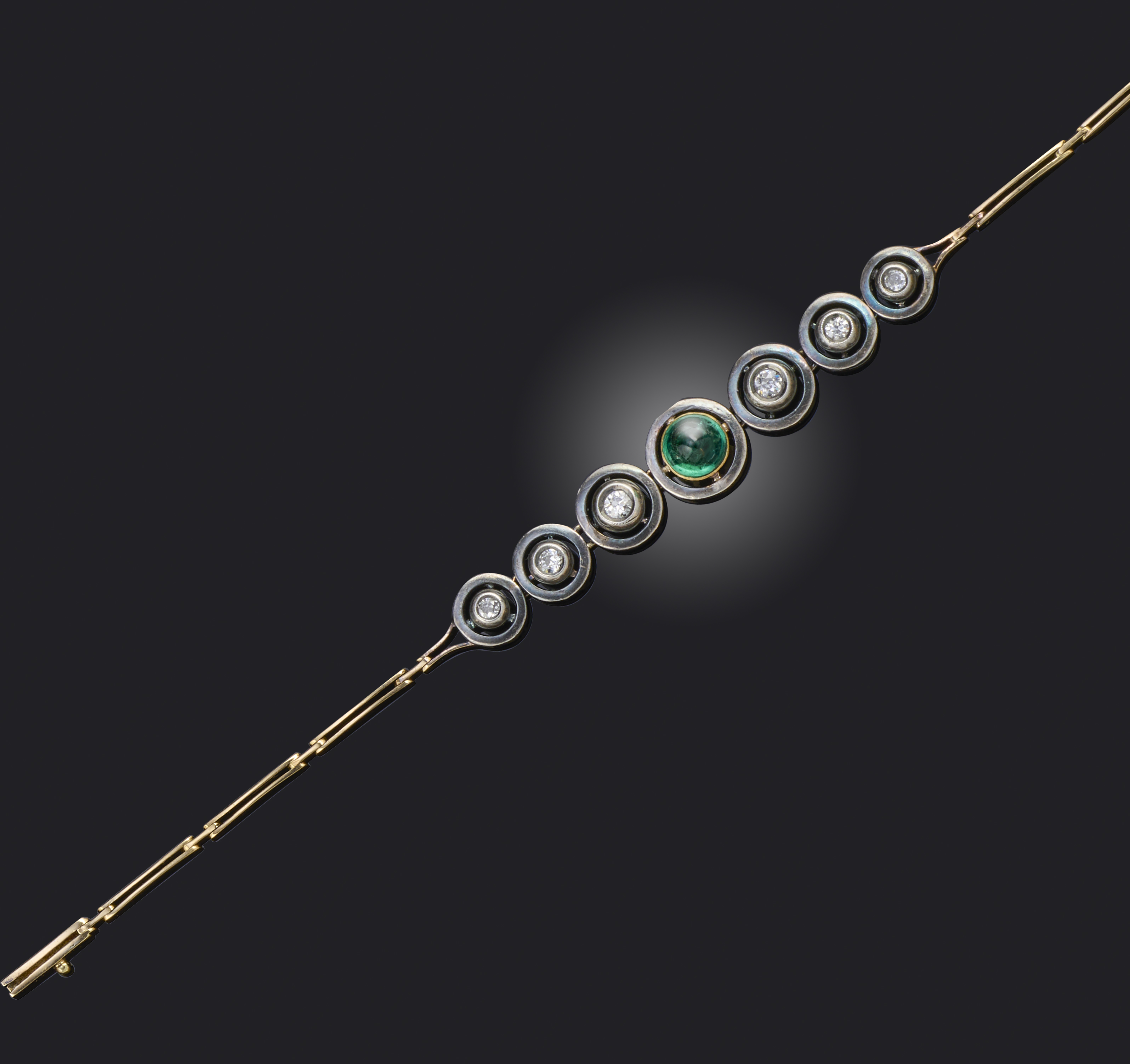 An emerald cabochon and diamond bracelet, set with a central sugarloaf emerald, within articulated