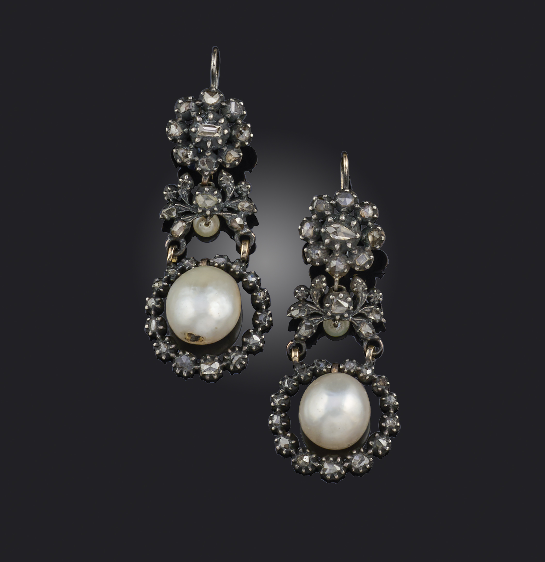 A pair of natural pearl and diamond earrings, each of pendent design, suspending a natural pearl within a foliate mount set with rose-cut diamonds, accented with another smaller pearl pendant, length 5.2cm each