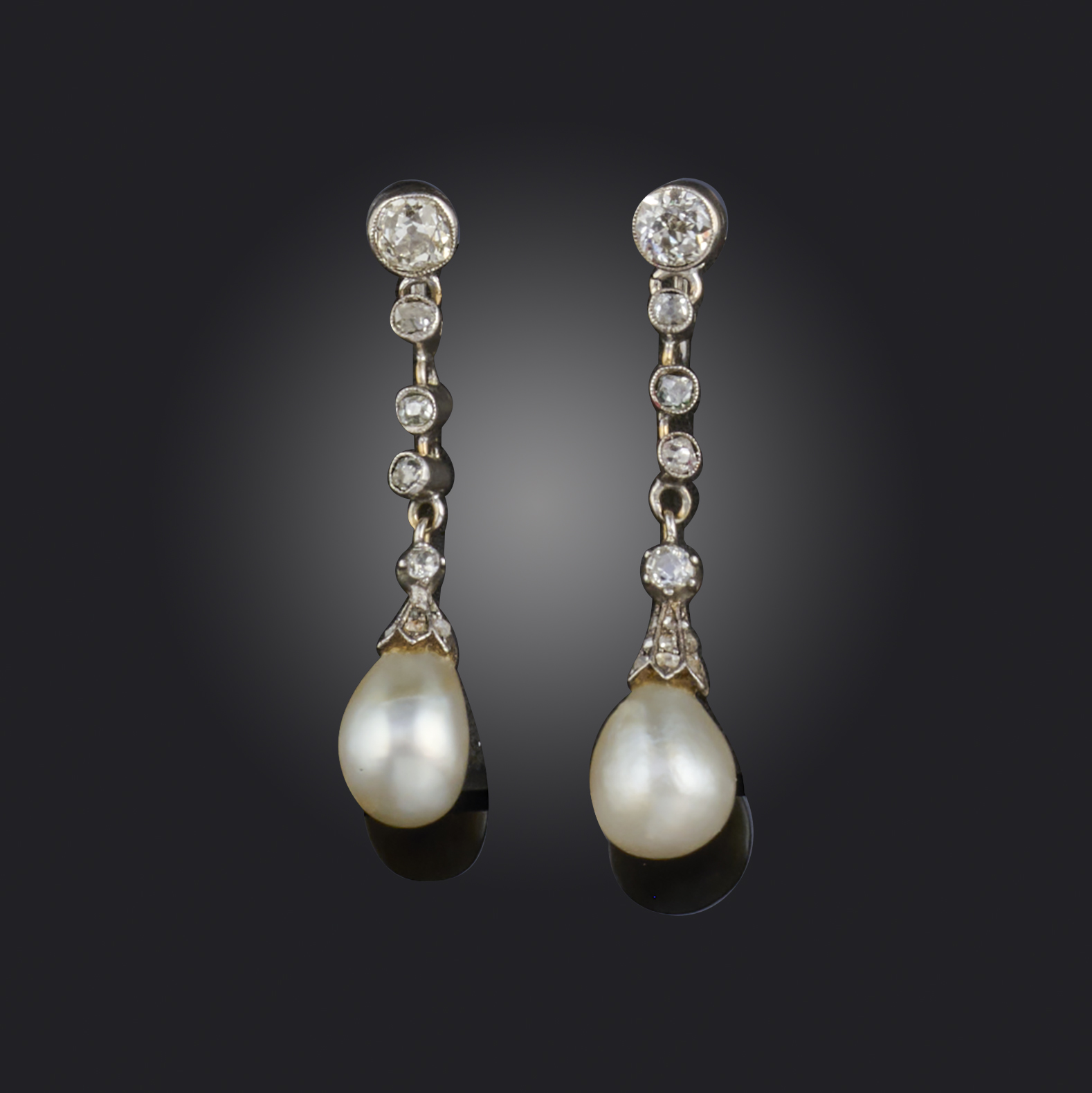 A pair of natural pearl and diamond drop earrings, set with articulated lines of cushion-shaped