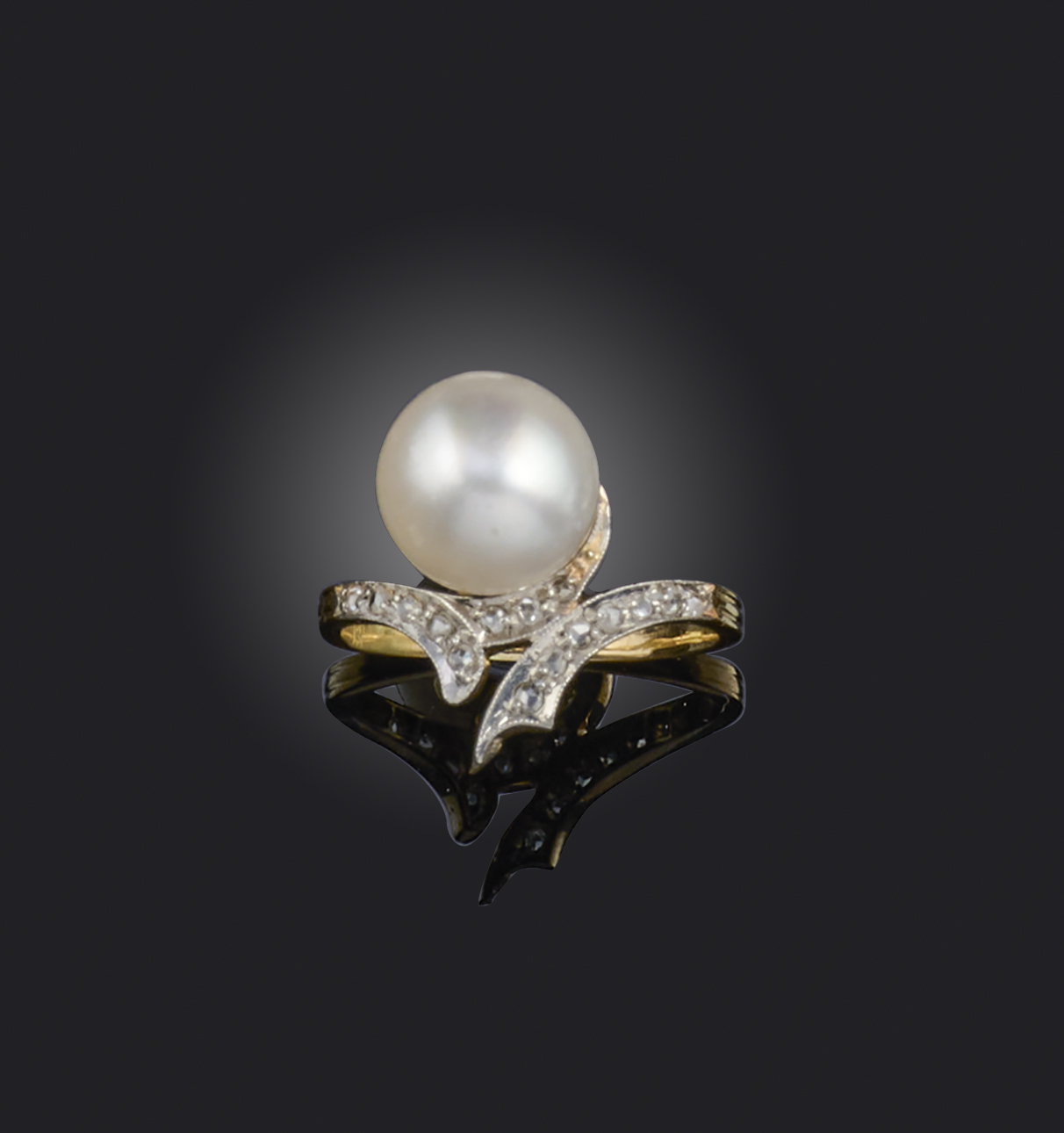 A natural pearl and diamond ring, early 20th century, of foliate design, set with a natural pearl measuring approximately 9.6-9.9 x 8.4mm, accented with rose-cut diamonds, mounted in gold, size L, case