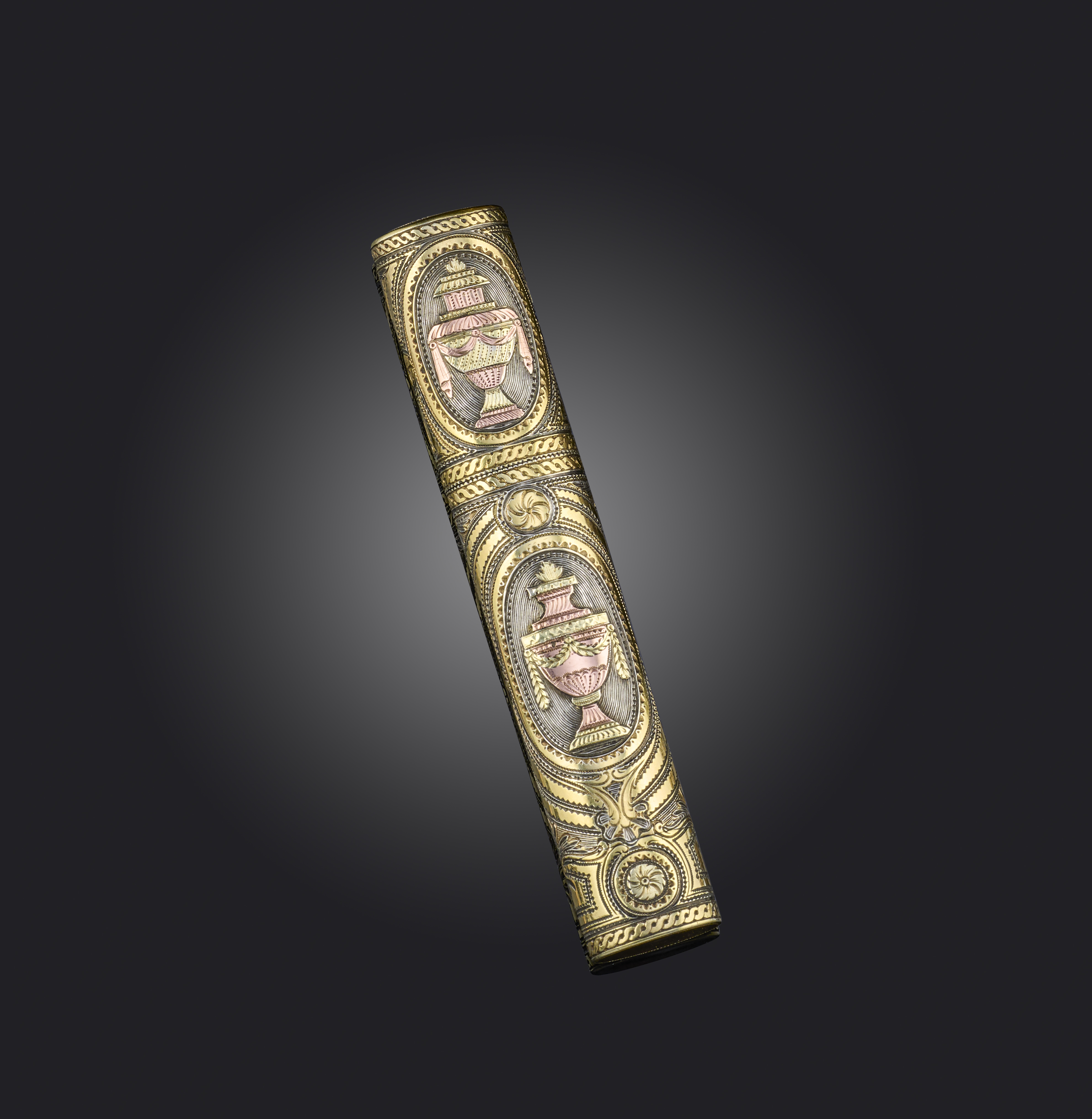 A gilt silver etui, 19th century, the cylindrical case of oval cross section, the exterior with three-tone decoration depicting urns within oval frames, opening to reveal a toothpick, a pair of scissors, a folding knife and a pencil, length 10.8cm