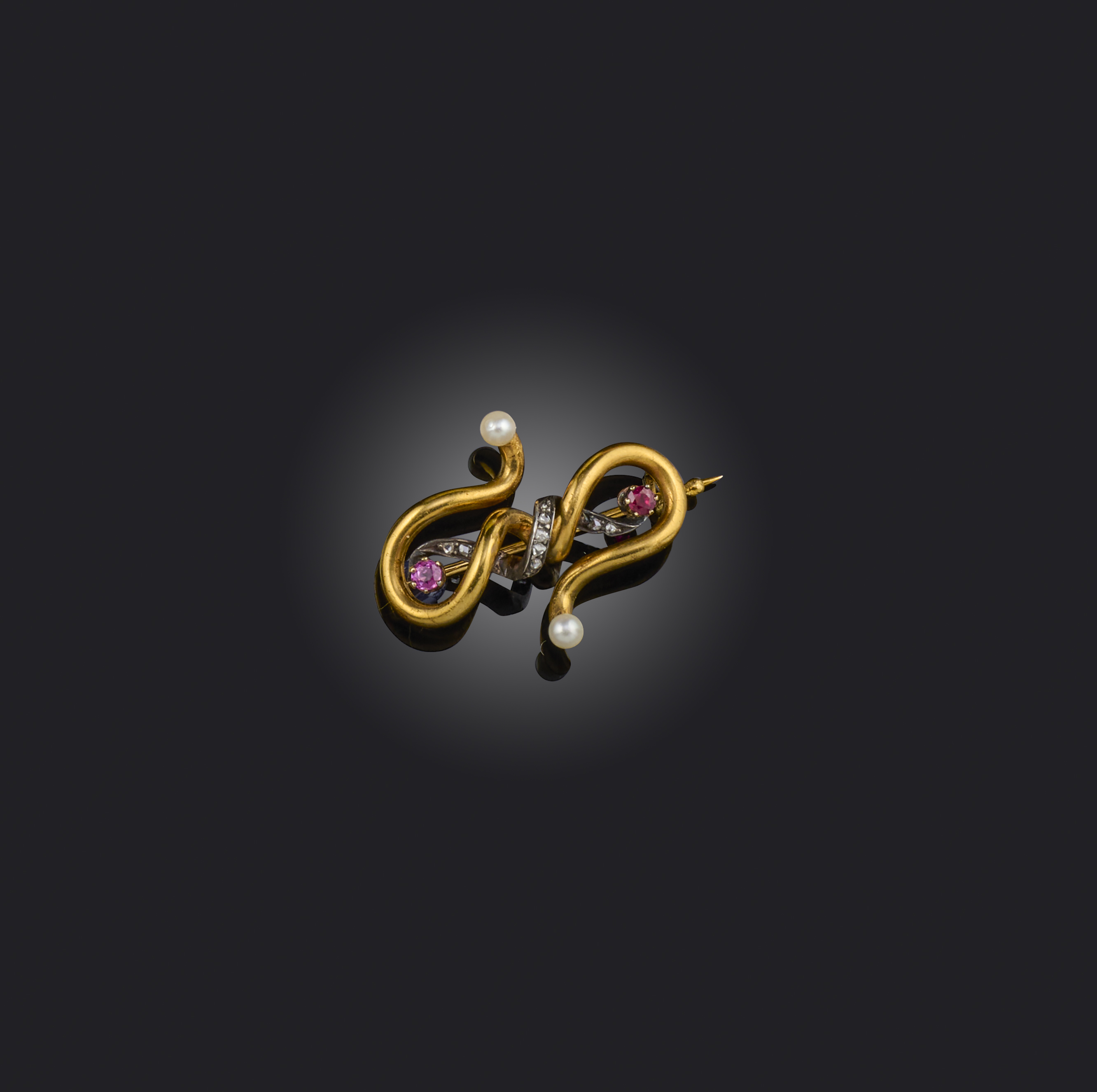 Fabergé, a ruby, seed pearl and diamond brooch, circa 1900, designed as entwined ribbons, one of