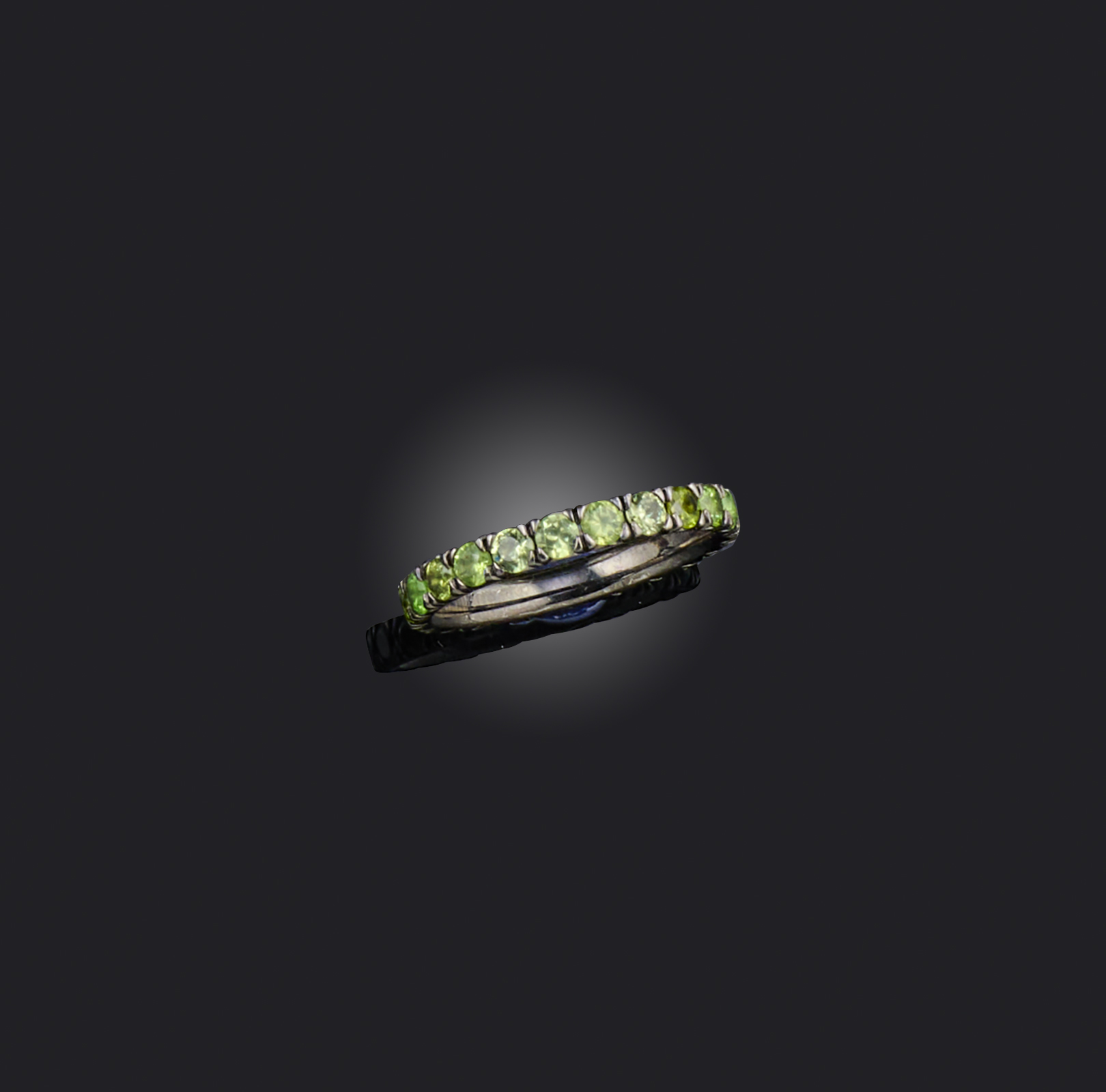 A demantoid garnet eternity ring, set with a continuous line of circular-cut demantoid garnets,