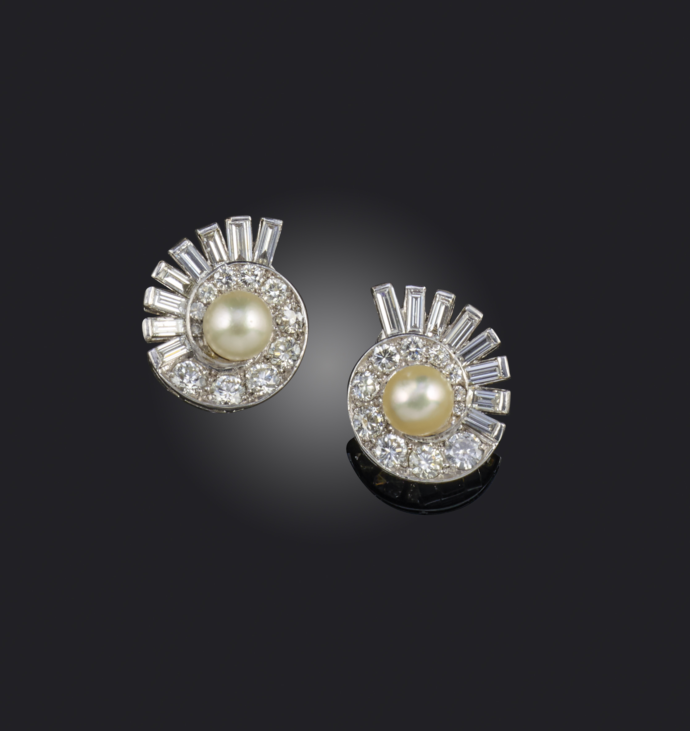 A pair of natural pearl and diamond earrings, mid 20th century, each of spiral design, centring on a natural pearl, within a surround of circular-cut and baguette diamonds, mounted in platinum in platinum, length 2.5cm each, post and clip fittings