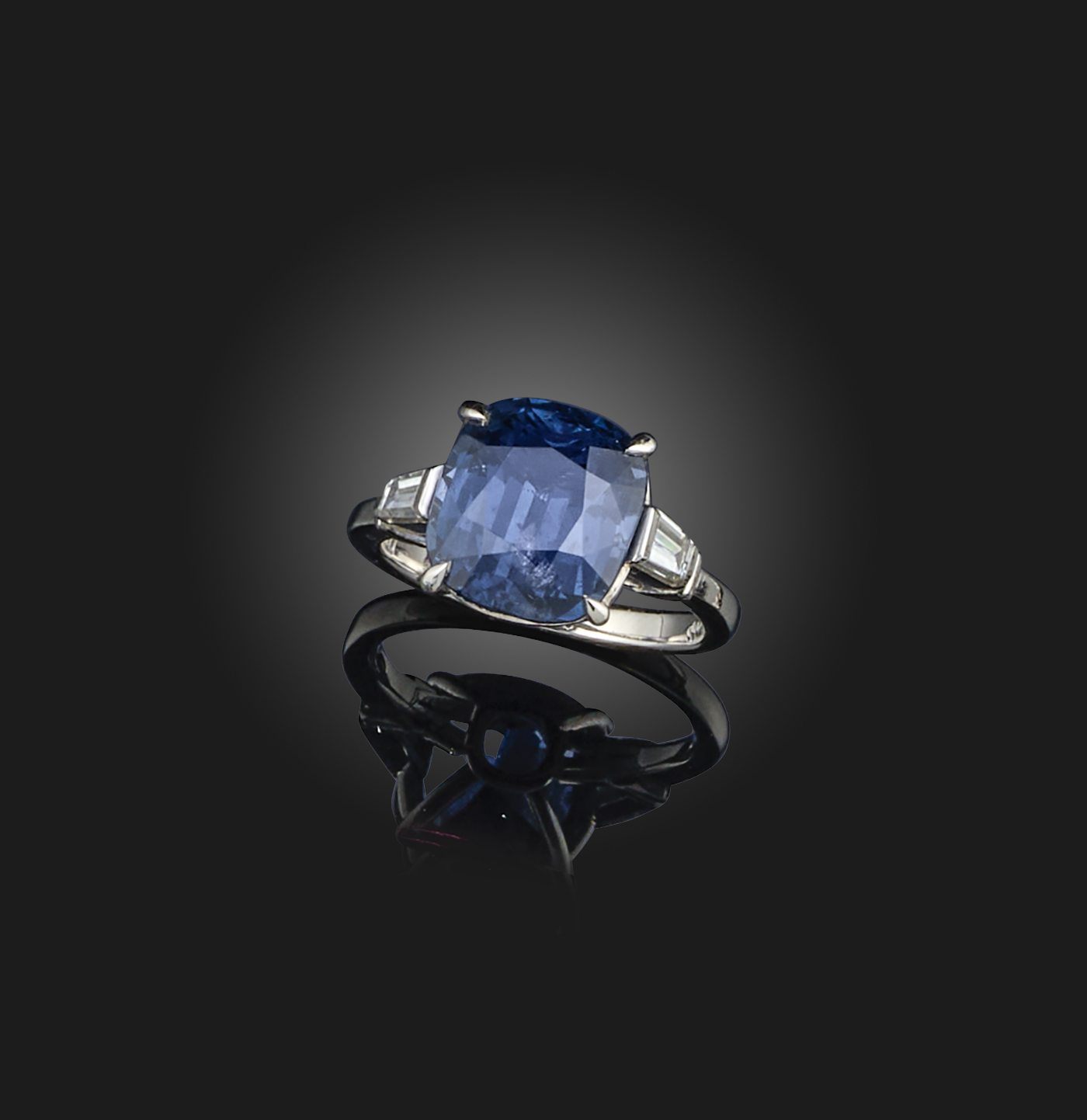 A blue spinel and diamond ring, set with a cushion-shaped blue spinel weighing 6.63 carats, between shoulders set with baguette diamonds, mounted in platinum, size N, case