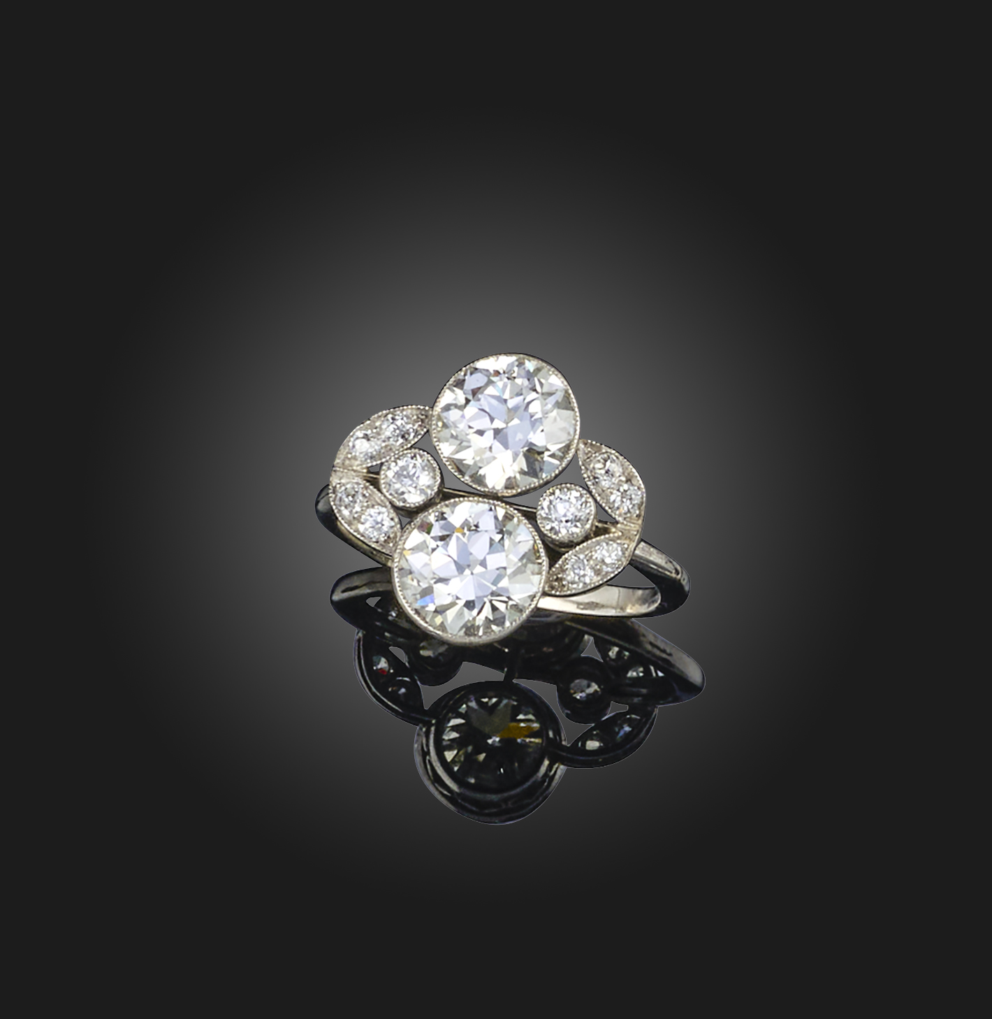 An Edwardian diamond cluster ring, with two principal diamonds weighing approximately 1.80 and