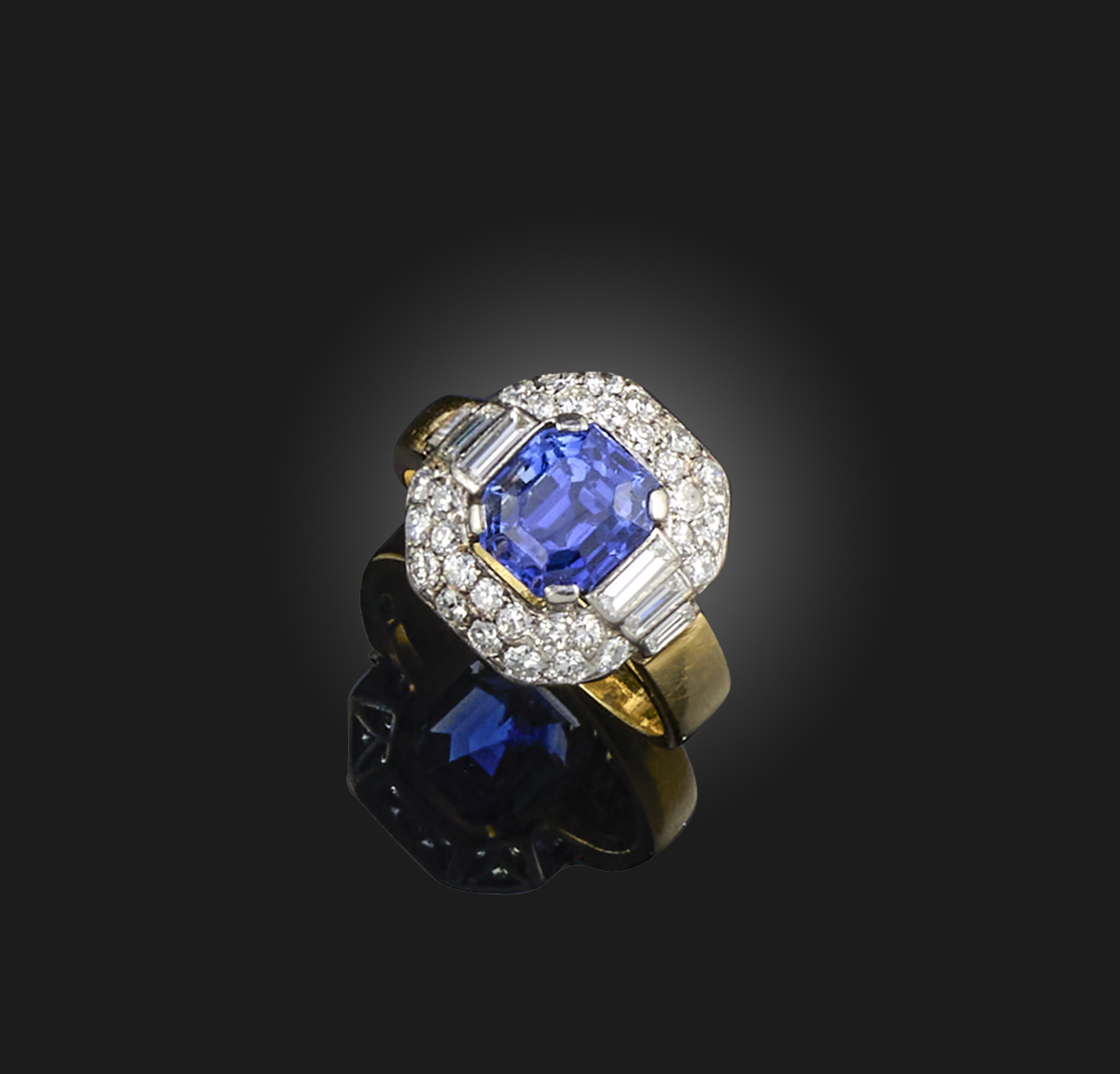 A sapphire and diamond ring, set with a step-cut sapphire measuring approximately 7.6 x 6.8 x 6.1mm, to a mount pavé-set with brilliant-cut diamonds, the shoulders set with baguette diamonds, to a gold band, size L1/2, French import assay marks for 18ct gold and platinum