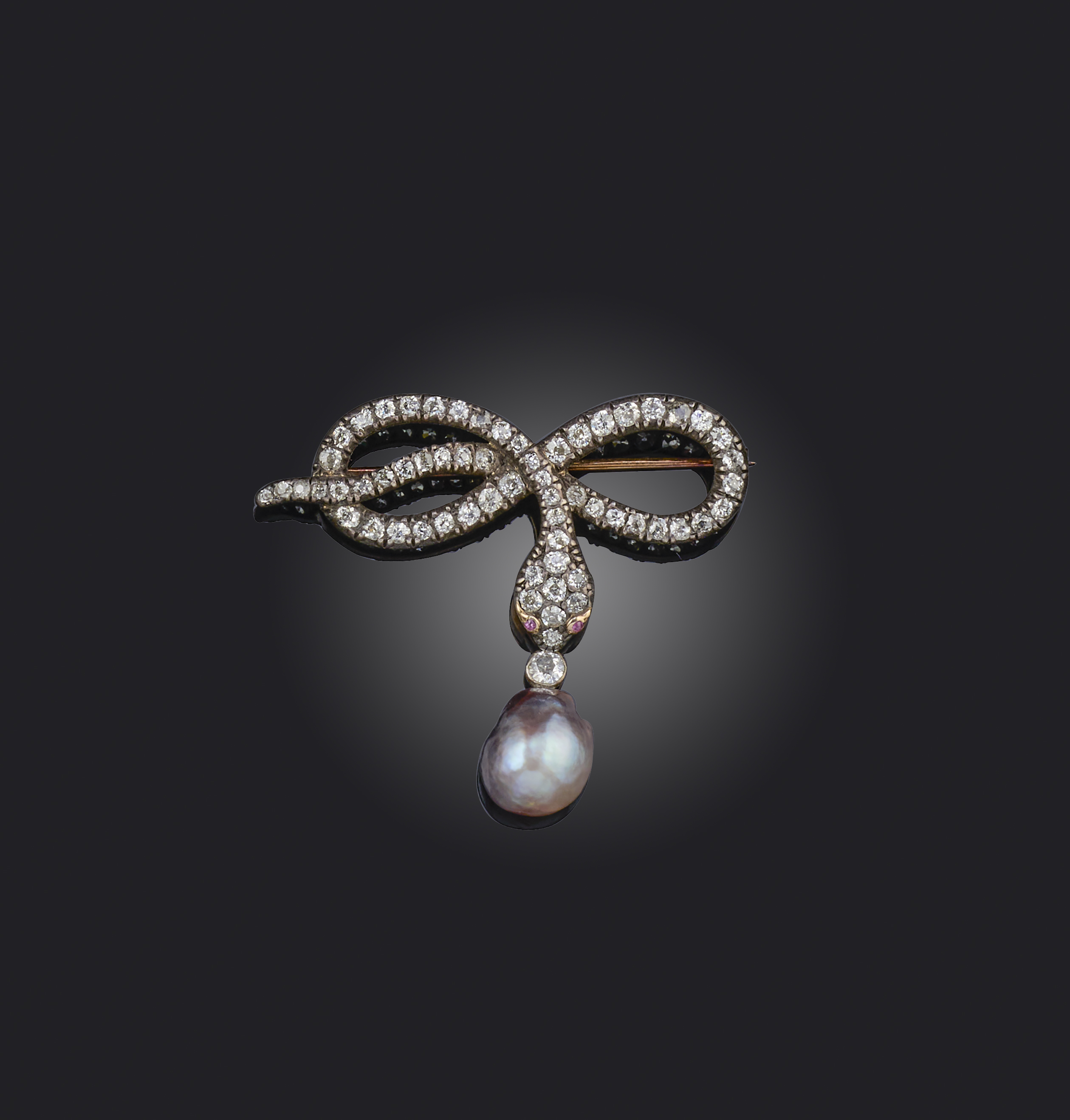 A pearl and diamond brooch, 19th century, in the form of a stylised snake set with cushion-shaped diamonds and ruby eyes, suspending a grey pearl from its mouth, mounted in silver and gold, length 4cm