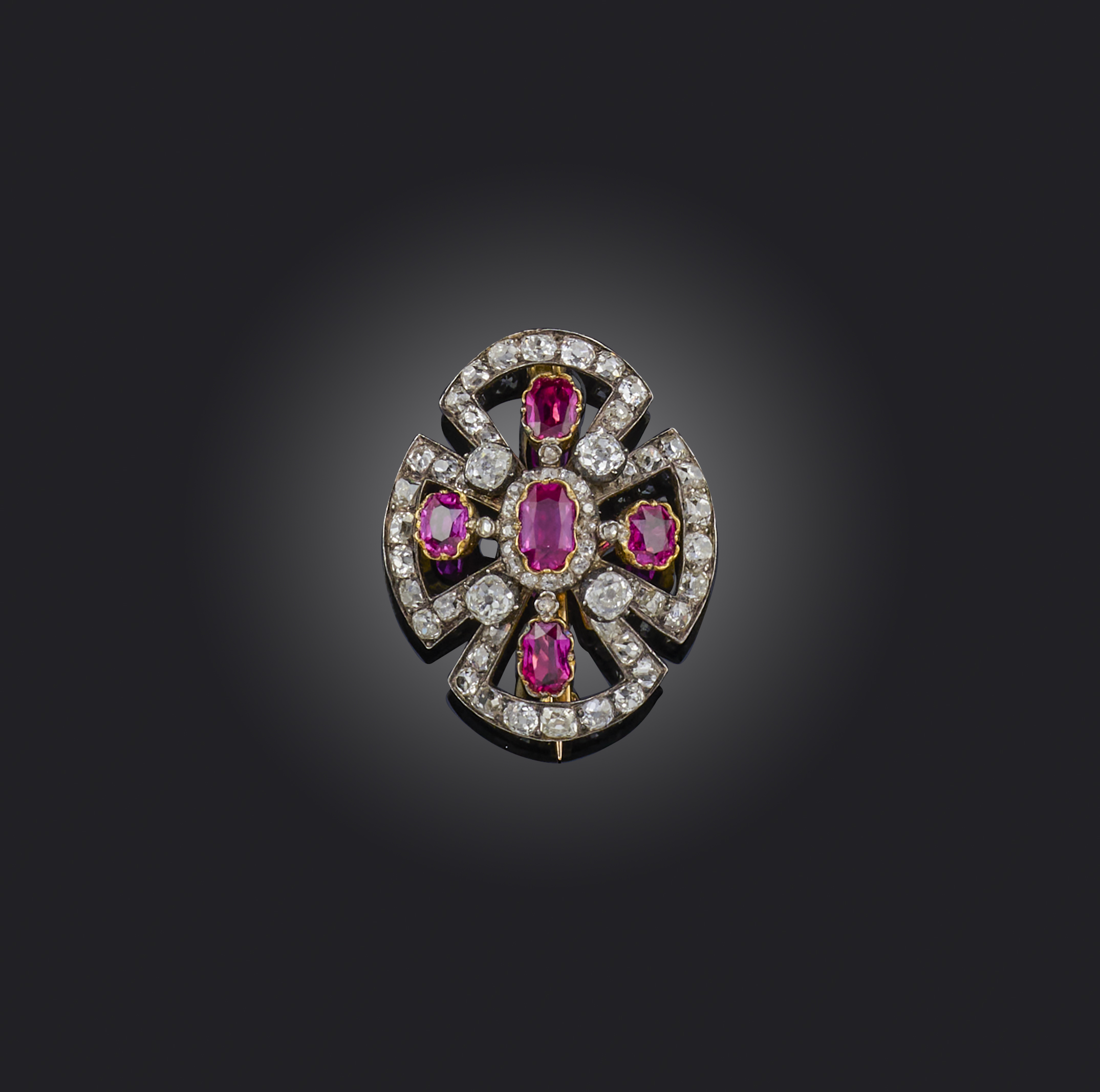 A ruby and diamond brooch, late 19th century, designed as a cross, set with graduated rubies and diamonds in silver and gold, detachable brooch fitting to reverse, length 3cm