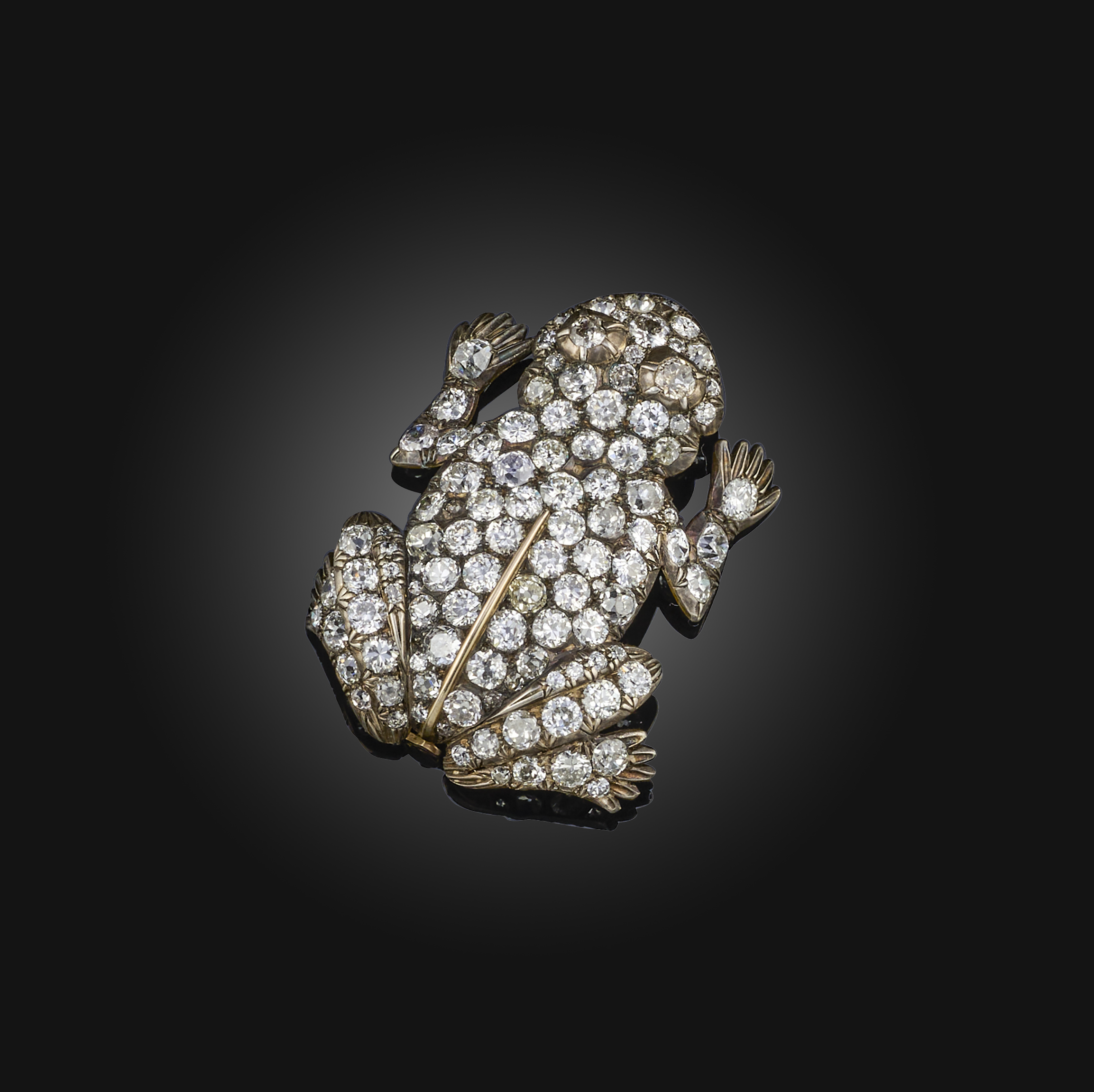 A diamond brooch, designed as a frog, pavé-set with cushion-shaped diamonds totalling approximately
