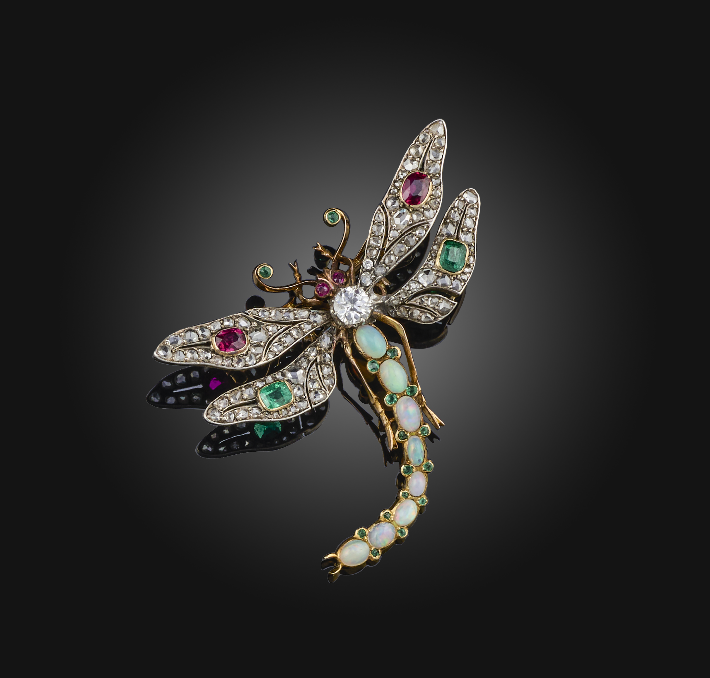 A Victorian gem-set and diamond brooch, late 19th century, designed as a dragonfly, set with cabochon and oval rubies, step-cut emeralds, opal cabochons and circular- and rose-cut diamonds, mounted in silver and gold, wingspan 5.2cm, detachable brooch fitting