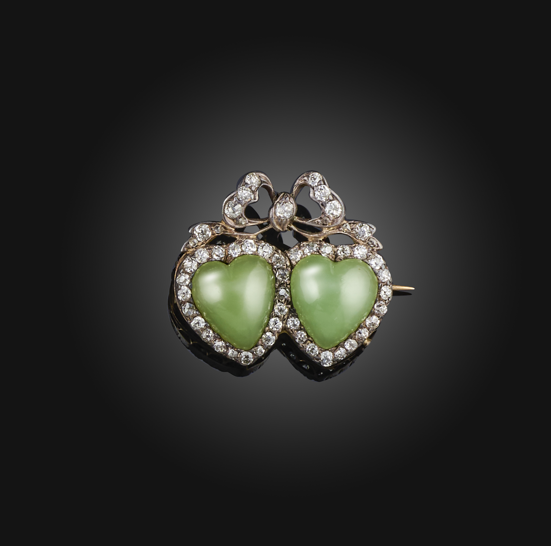 A Victorian chrysoprase and diamond brooch, late 19th century, designed as two hearts surmounted by a ribbon bow, set with polished heart-shaped chrysoprase cabochons and bordered with circular-cut diamonds, mounted in silver and gold, length 2.9cm