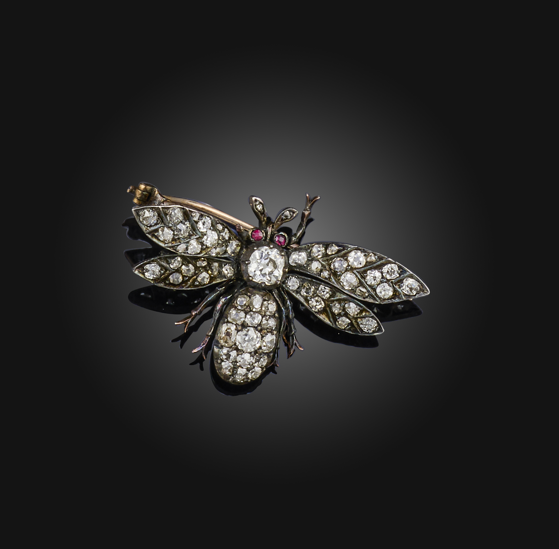A Victorian diamond and ruby brooch, late 19th century, designed as a bee, set with cushion-shaped and rose-cut diamonds, its eyes set with cushion-shaped rubies, mounted in silver and gold, wingspan 4.1cm, one foreleg deficient