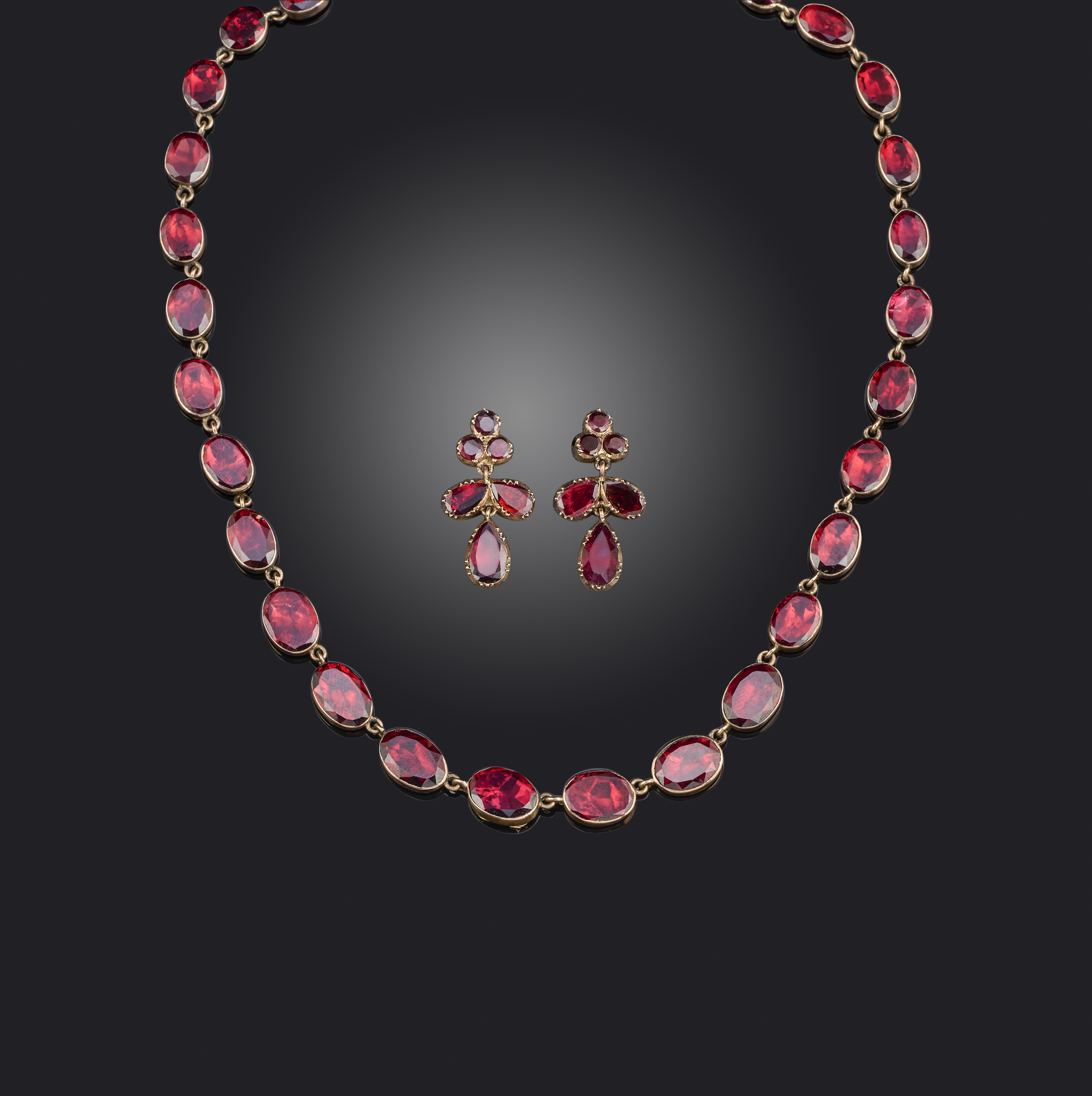 A garnet demi-parure, 19th century and later, comprising: a rivière necklace composed of flat oval