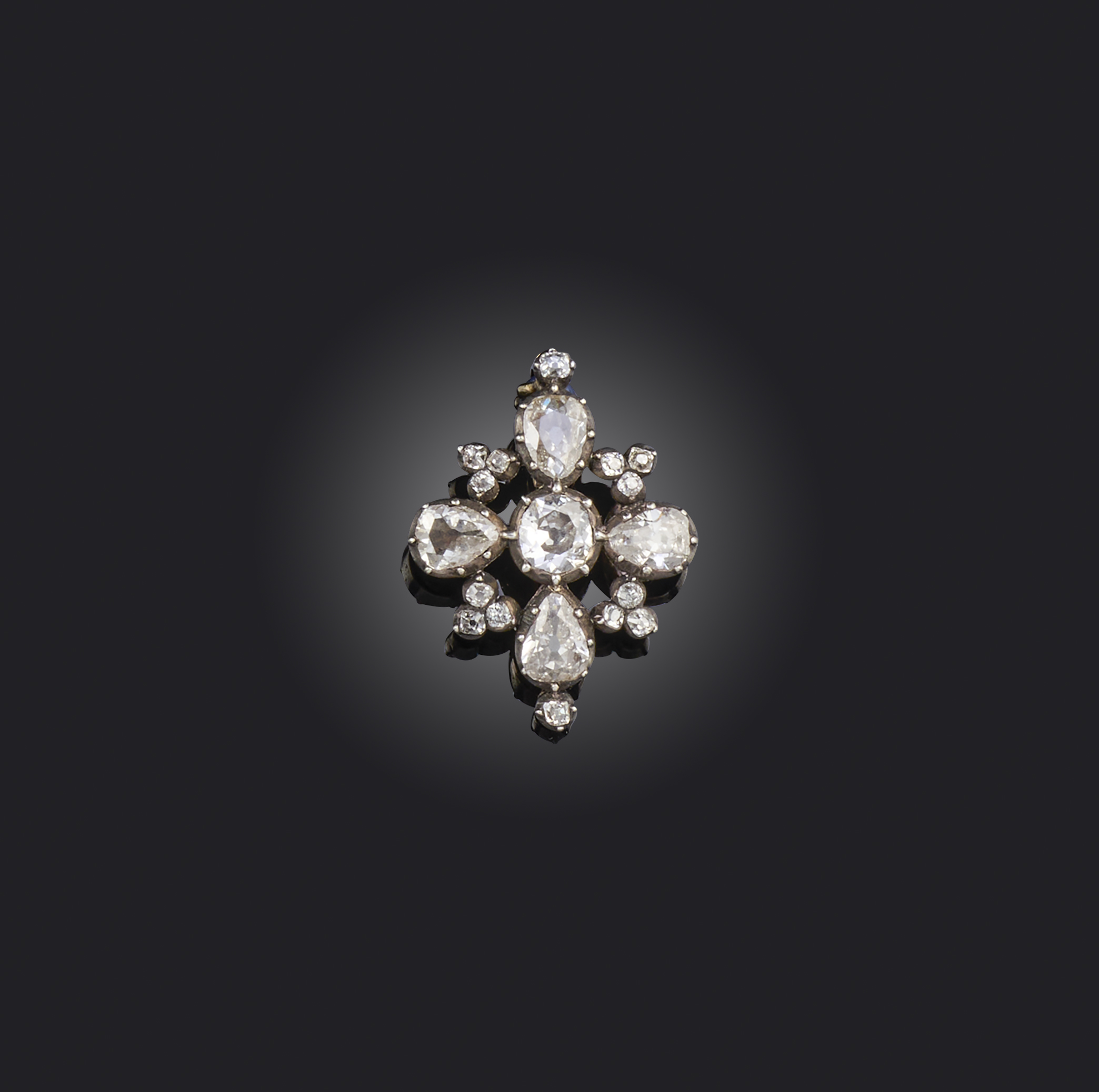 A George III diamond brooch, of quatrefoil design set with graduated cushion-shaped and pear-shaped