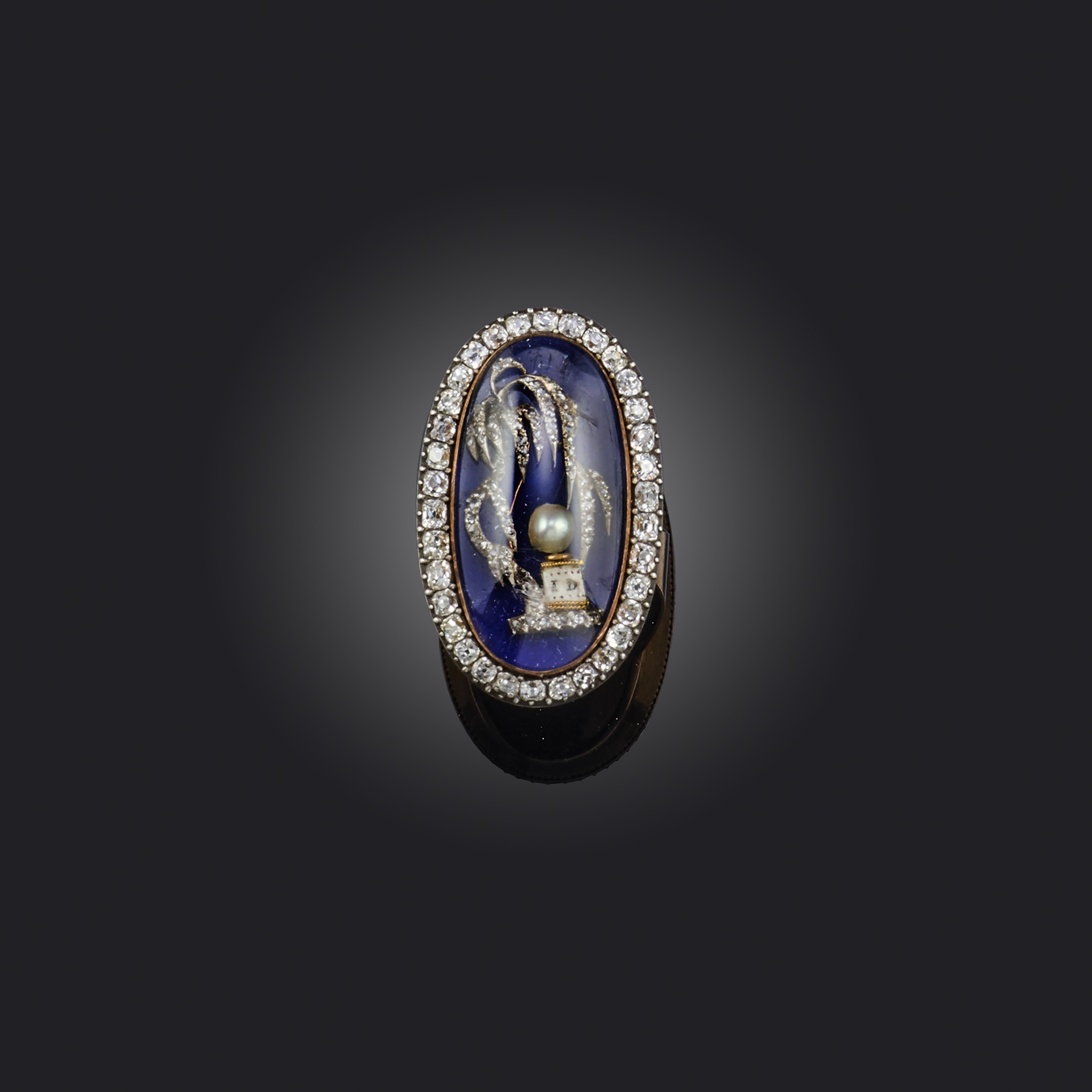 λ No reserve - a superb pearl, enamel and diamond mourning ring, circa 1791, of oval outline, centring on a funerary monument composed of an ivory panel initialled ID, surmounted by a pearl, to a rose-cut diamond base, beneath a three-dimensional weeping willow set with rose-cut diamonds, on a blue enamel ground, covered by a glazed panel, to an outer border of cushion-shaped diamonds, the reverse with a glazed compartment containing hairwork, bordered by the dedicatory inscription 'Ja.s Duberly Esq died 4 July 1791 Aged 64', mounted in silver and gold, size Q1/2, front measuring 3.5 x 2.1cm, pearl untested