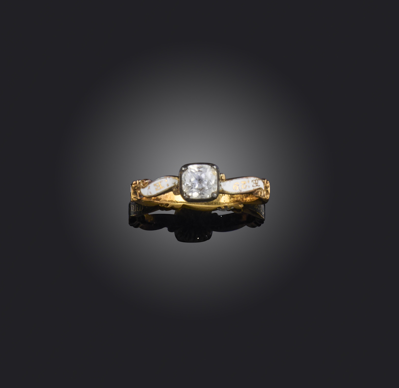 A rock crystal and enamel mourning ring mid 18th century, set with a cushion-shaped rock crystal, to a scrolling white enamel shank, dated 1739, size L