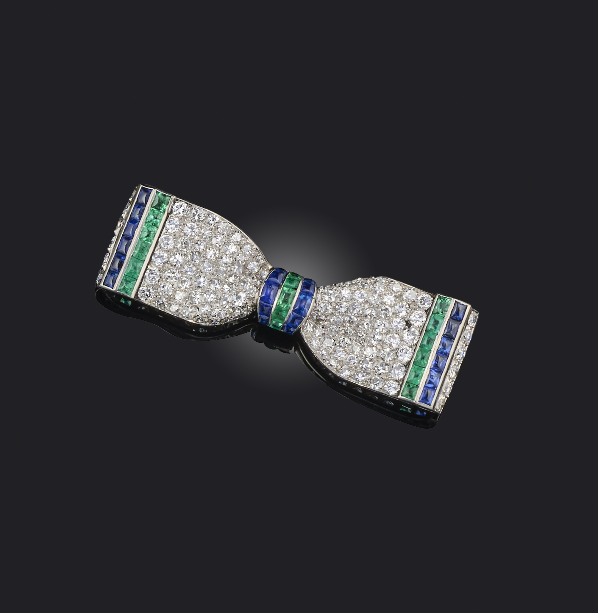 Henri Picq, an Art Deco emerald, sapphire and diamond brooch, 1920s, naturalistically modelled as a ribbon bow, pavé-set with circular-cut diamonds, accented with lines of buff-topped calibré-cut emeralds and sapphires, mounted in platinum, length 4.9cm, French assay marks for platinum and 18ct gold, partial maker's mark HP with ace of spades for Henri Picq, numbered 88114