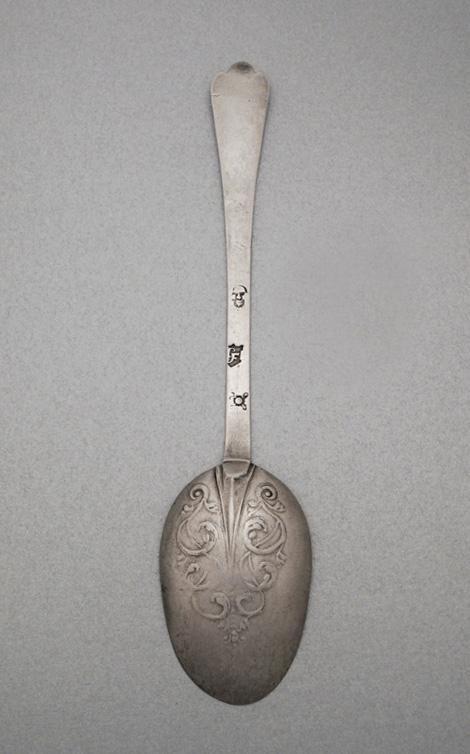 A William and Mary spoon, with a tapering stem, crudely pricked 'C.P over 1691', maker Francis Glanville, Launceston, c.1691, 6.8in (17.7cm).