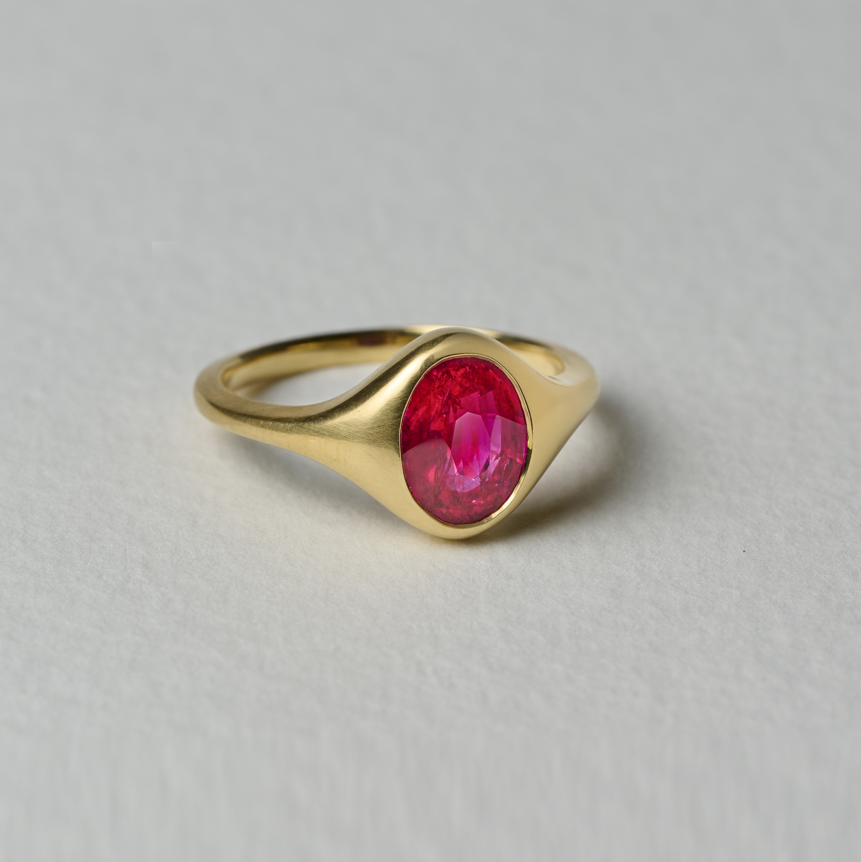 A ruby single-stone ring, rubover-set with an oval ruby weighing 2.09 carats, to a tapering gold band, size M